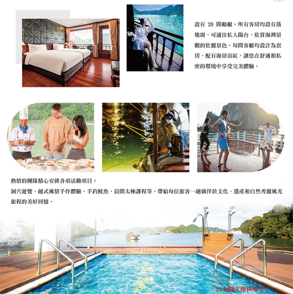 【第3天】吉婆島 →五星級下龍AQUA CRUSE 水世界遊輪:參觀下龍灣 - 珍珠村 - 游泳 - 皮划艇(午餐/晚餐)升等:陽臺景觀房 (郵輪行程僅供參考,以船公司安排為主) |