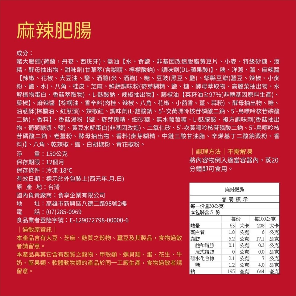 本產品含有大豆、芝麻、麩質之穀物、蠶豆及其製品,食物過敏者請留意。
