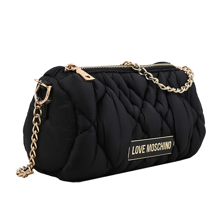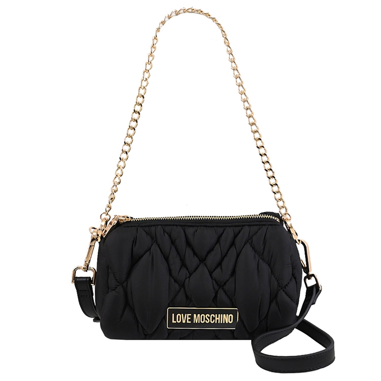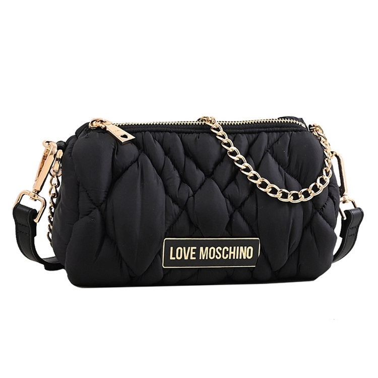 MOSCHINO (莫斯奇諾) 來自於義大利品牌創立於1983年,以泰迪熊作為設計元素、大玩印花或飽和色彩,近年來名人網紅界討論度極高品牌,世人稱呼為歐洲朝牌鼻祖;經典LOVE MOSCHINO系列,採用金屬牌標誌LOGO+尼龍絎縫材質,拉鍊開口,內可放皮夾、手機等隨身物品,可斜側背或單肩背手提使用,是出遊或逛街最佳的包款。