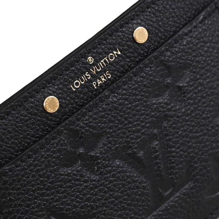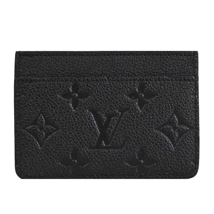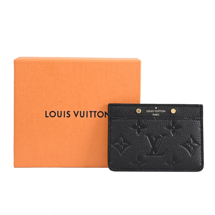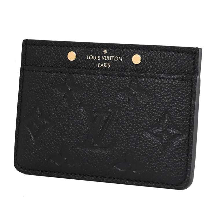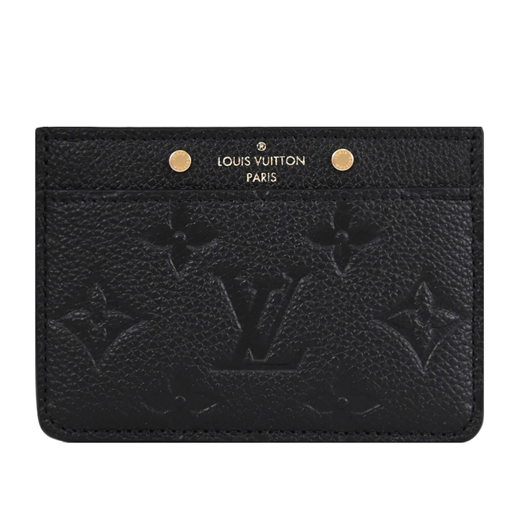 Louis Vuitton專櫃經典名片夾,採用Monogram Empreinte牛皮所製,精心飾以經典Monogram壓花圖案,上側綴以兩枚金色飾釘,適合存放信用卡、卡片或乘車證等,是熱銷經典款配件,雅緻又實用,可輕易放入包包或口袋。