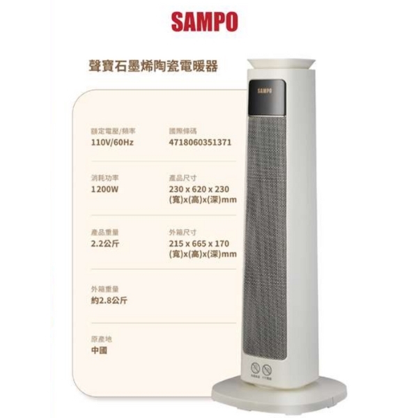 SAMPO 聲寶 石墨烯陶瓷電暖器HX-LM12P