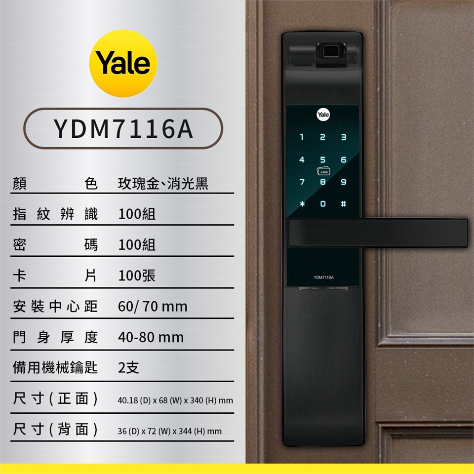 品名:Yale YDM7116A指紋卡片五合一電子鎖-消光黑/玫瑰金(含基本安裝)