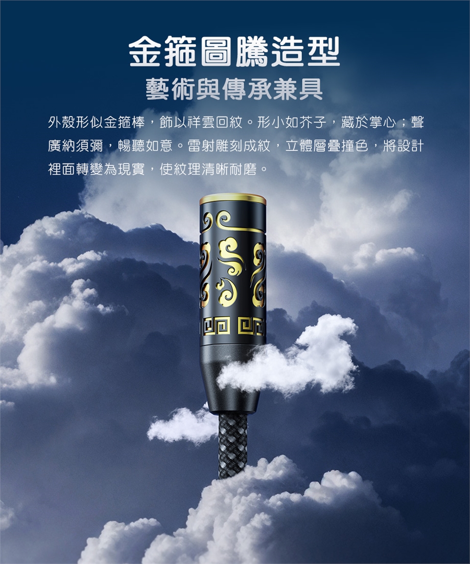 外殼形似金箍棒,飾以祥雲回紋。形小如芥子,藏於掌心;聲廣納須彌,暢聽如意。雷射雕刻成紋,立體層疊撞色,將設計裡面轉變為現實,使紋理清晰耐磨。
