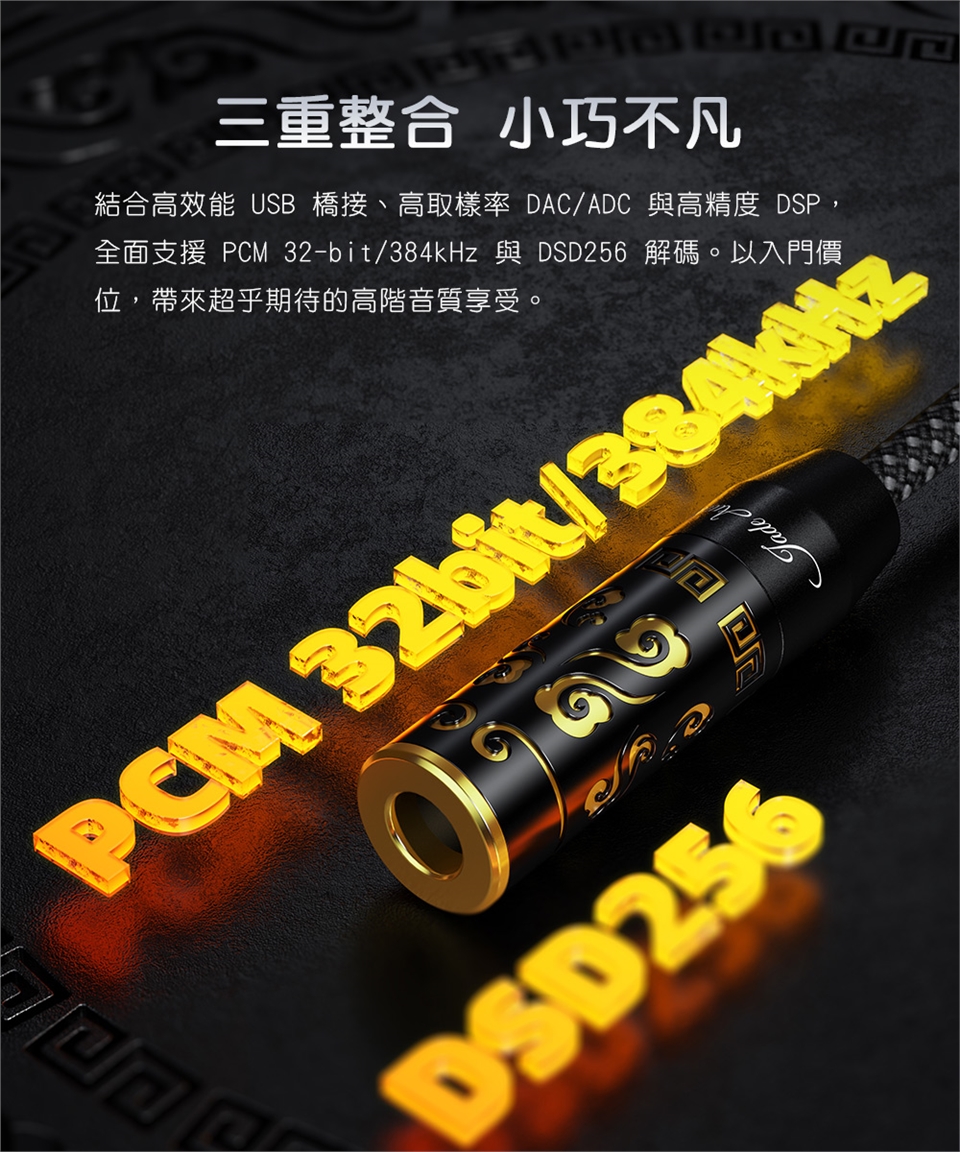 結合高效能 USB 橋接、高取樣率 DAC/ADC 與高精度 DSP,全面支援 PCM 32-bit/384kHz 與 DSD256 解碼。以入門價位,帶來超乎期待的高階音質享受。