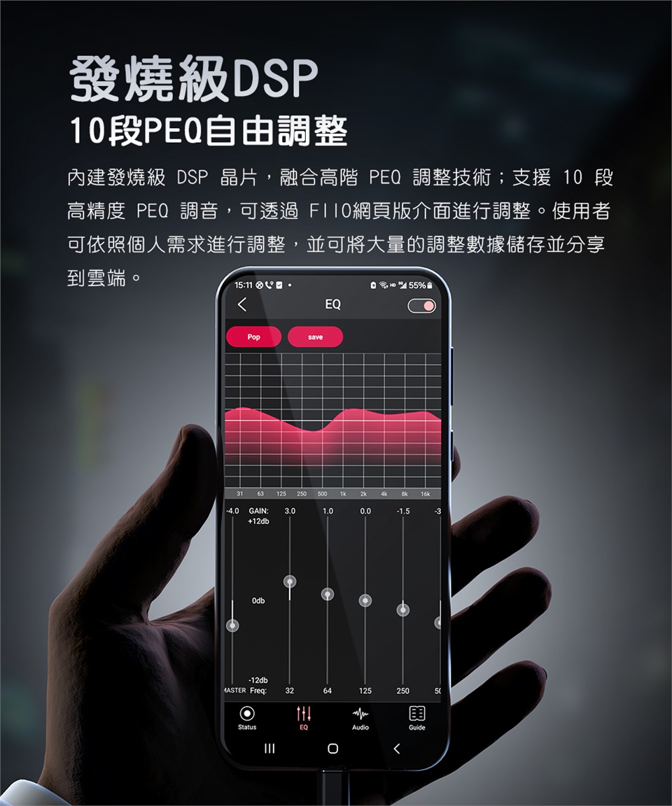 內建發燒級 DSP 晶片,融合高階 PEQ 調整技術;支援 10 段高精度PEQ 調音,可透過 FIIO網頁版介面進行調整。使用者可依照個人需求進行調整,並可將大量的調整數據儲存並分享到雲端。
