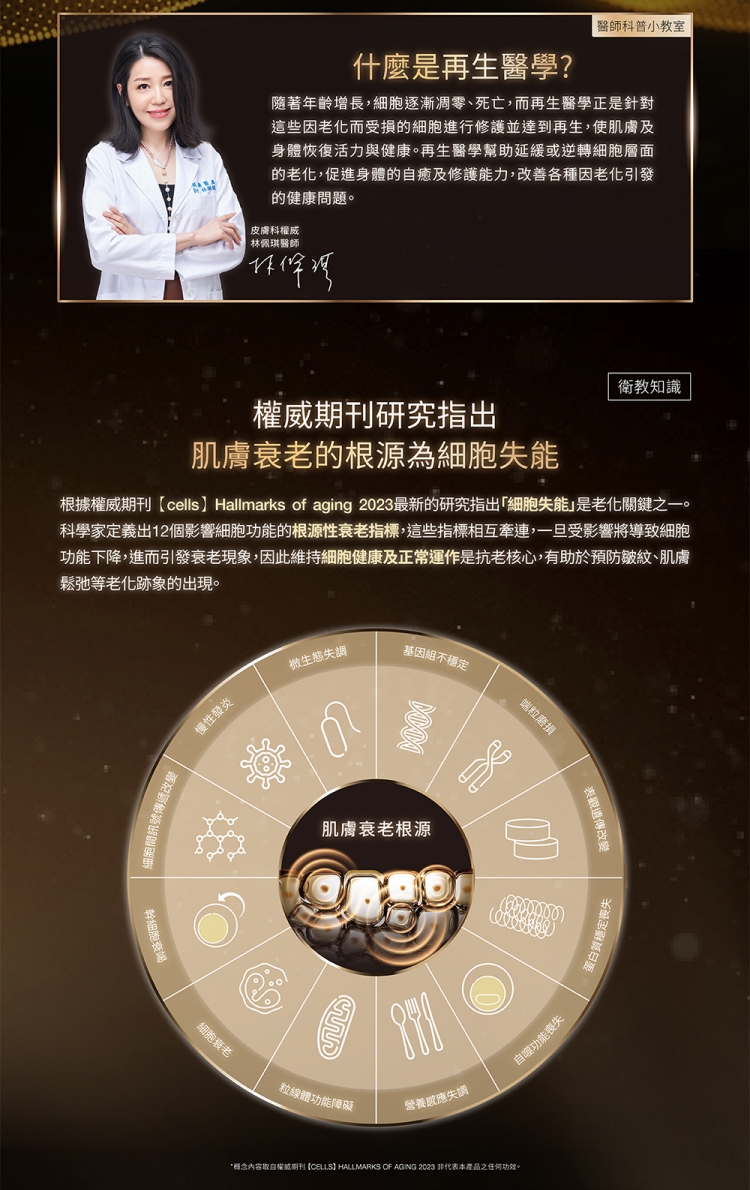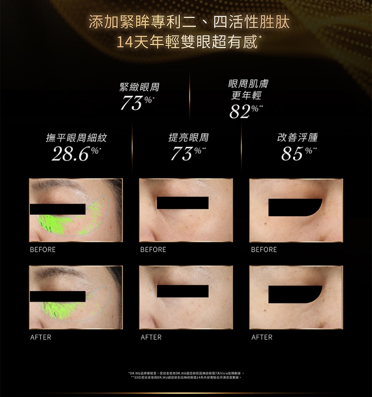 業界獨家「超逆齡肌因再生科技 AGEVERSAL」,結合再生醫學理論,以「煥新、修復、賦活」三大機制,從根源解決老化狀況,代謝老廢肌因,並提升肌因自我再生力及修護力,全面啟動肌因再生,賦活肌膚年輕狀態。緊眸專利二、四胜肽,搭配五、六雙重胜肽,促進眼周循環!搭配取自阿爾卑斯山脈嚴峻氣候生長雪絨花精萃,具強效抗氧化力,協同膠原蛋白第一型、第四型作用力,深層修護肌底結構,點線面提升肌膚彈性與厚度!搭配冰感亮眼筆頭,圓弧曲線設計,完美貼合眼周輪廓,打造電力滿點的雙眸!