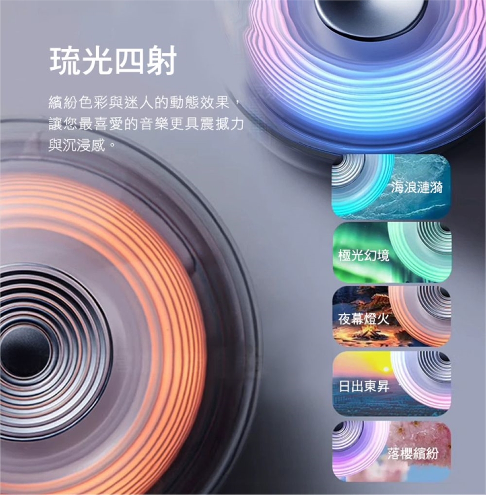 提供5種動態燈光效果:海浪漣漪、極光幻境、夜幕燈火、日出東昇、落櫻繽紛,另有1種靜態模式可選