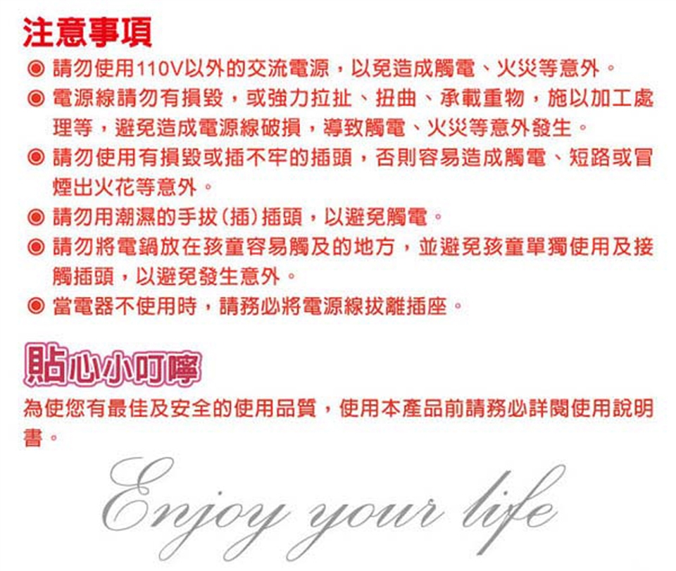 附件:內鍋x1、蒸盤x1、蒸架x1、蒸杯x4、量杯x1、飯匙x1
