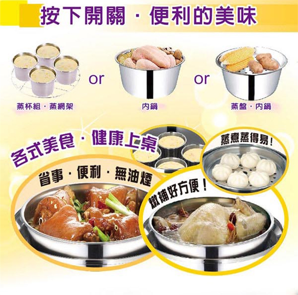 *外殼、內鍋、外鍋、蒸盤、蒸杯全不鏽鋼
