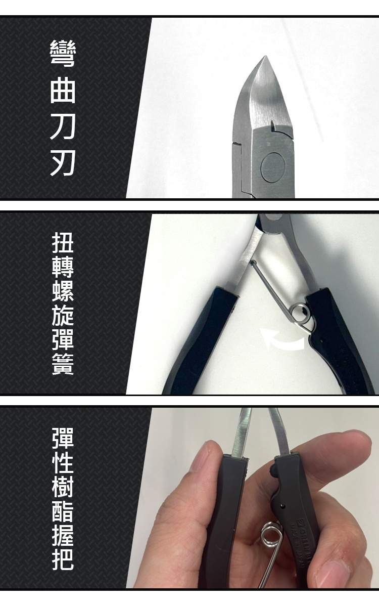 3.本公司原創的「螺旋彈簧」已通過 5 萬次耐久測試,兼具堅固與柔軟性,長時間使用也不易疲勞,剪指甲輕鬆方便。使用時請將彈簧撐起後使用。