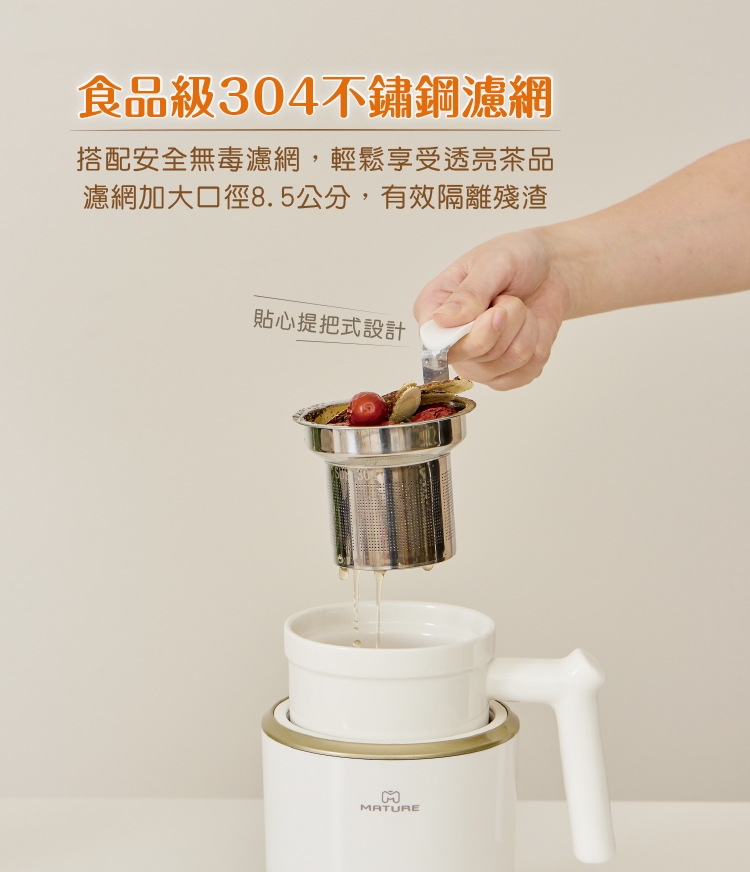 商品材質:杯體含蓋-陶瓷、杯蓋隔熱套-矽膠、機身-PC塑膠、PP塑膠、量杯-PP塑膠、濾網-304不鏽鋼