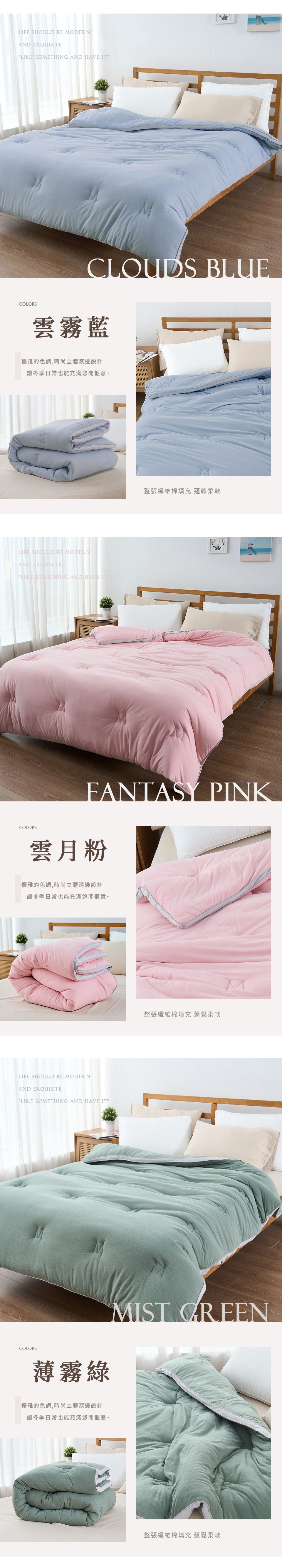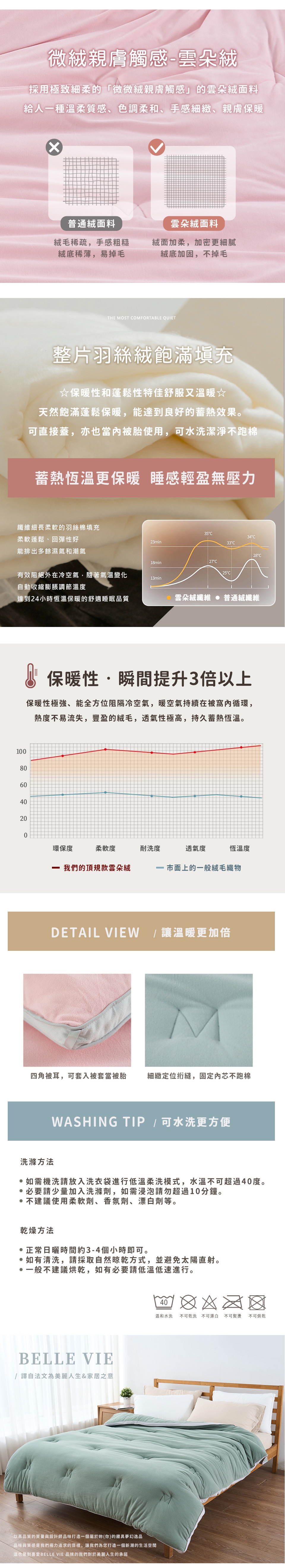 天然飽滿不壓身、不跑棉,被芯含有大量的空層,能阻止外部冷空氣進入及內部熱空氣散發,以達到良好的保暖效果。