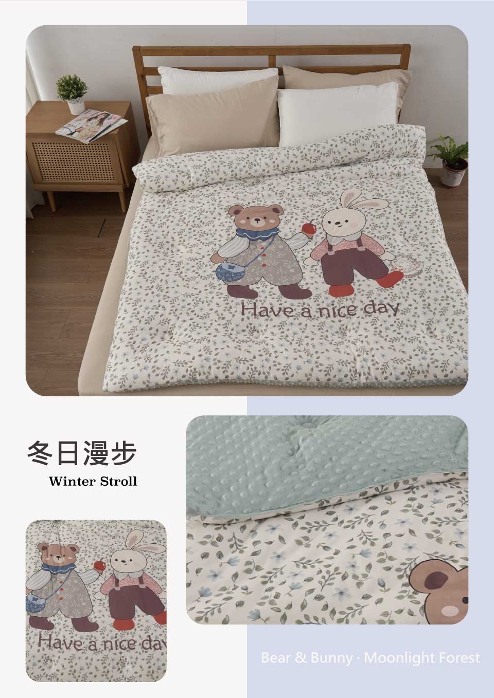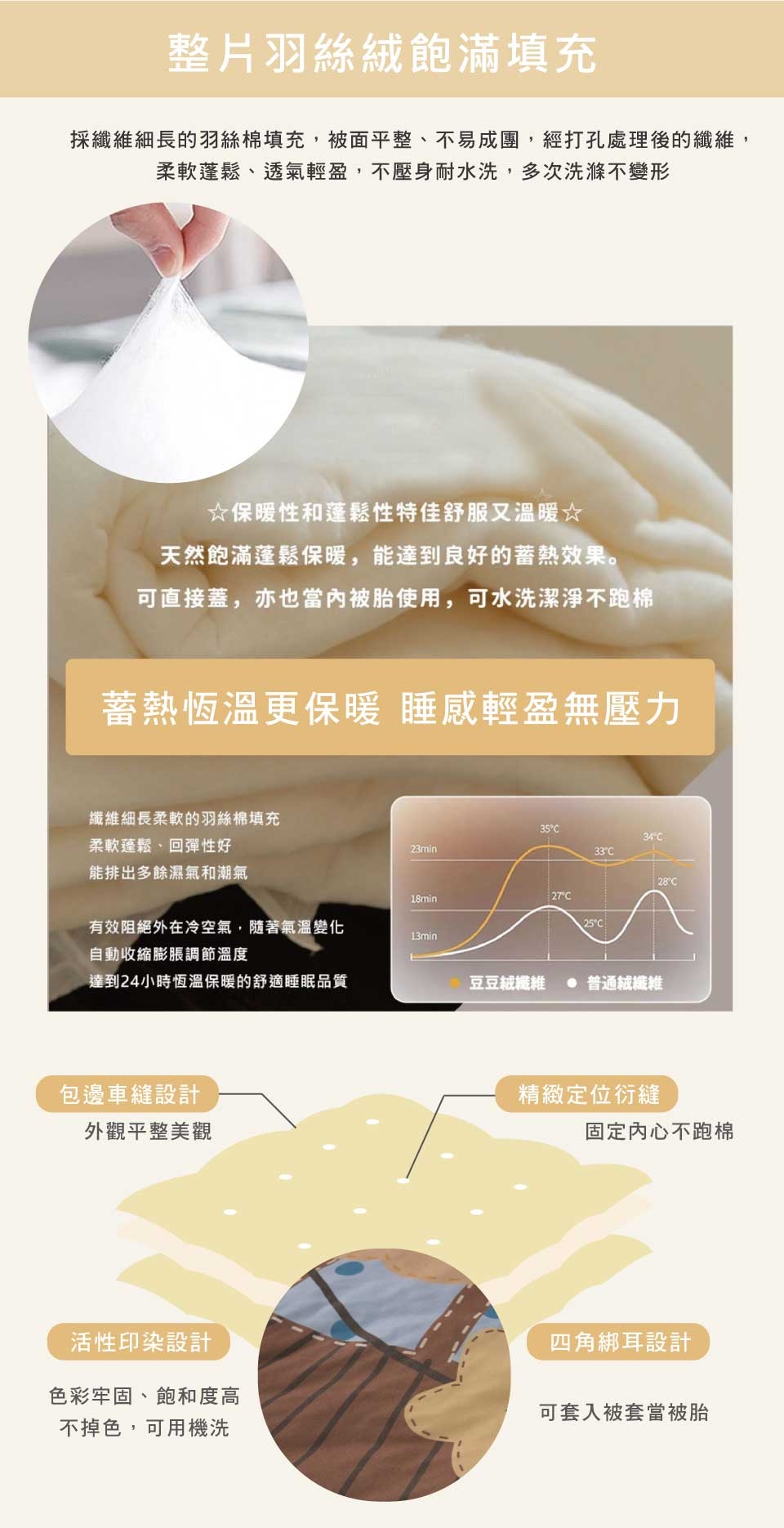天然飽滿不壓身、不跑棉,被芯含有大量的空層,能阻止外部冷空氣進入及內部熱空氣散發,以達到良好的保暖效果。