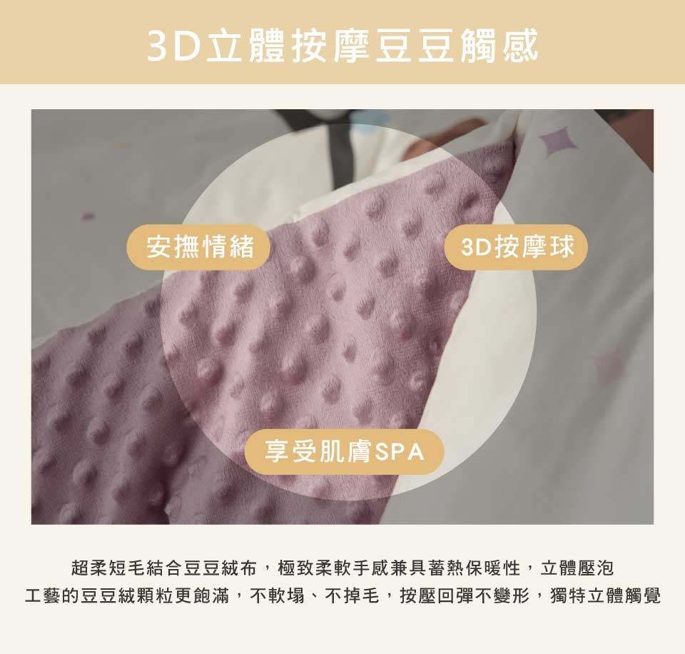 特殊療癒觸感,顆粒更飽滿,不軟塌掉毛、按壓回彈不變形,具有安撫情緒效果,達到一整晚安穩的睡眠。