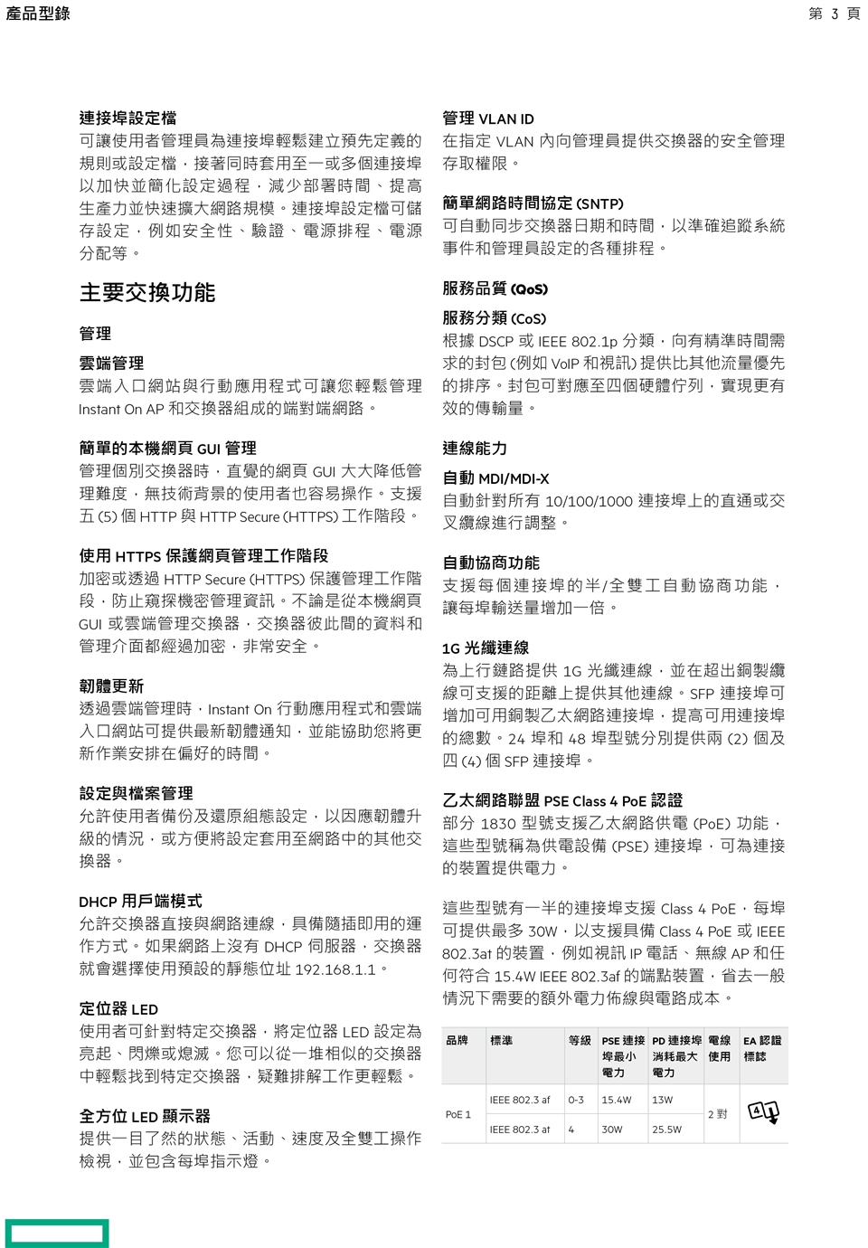 連接埠24 個 RJ-45 10/100/1000 Class 4 PoE 連接埠,2 個 SFP 1 GbE 連接埠