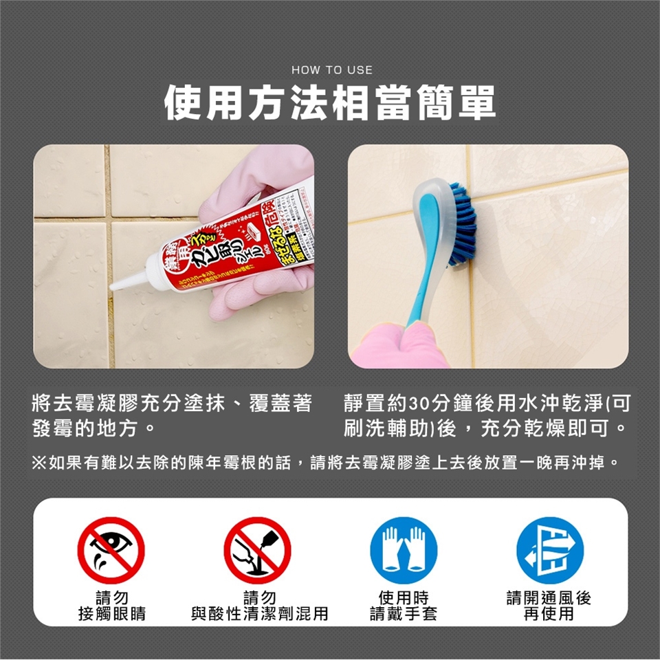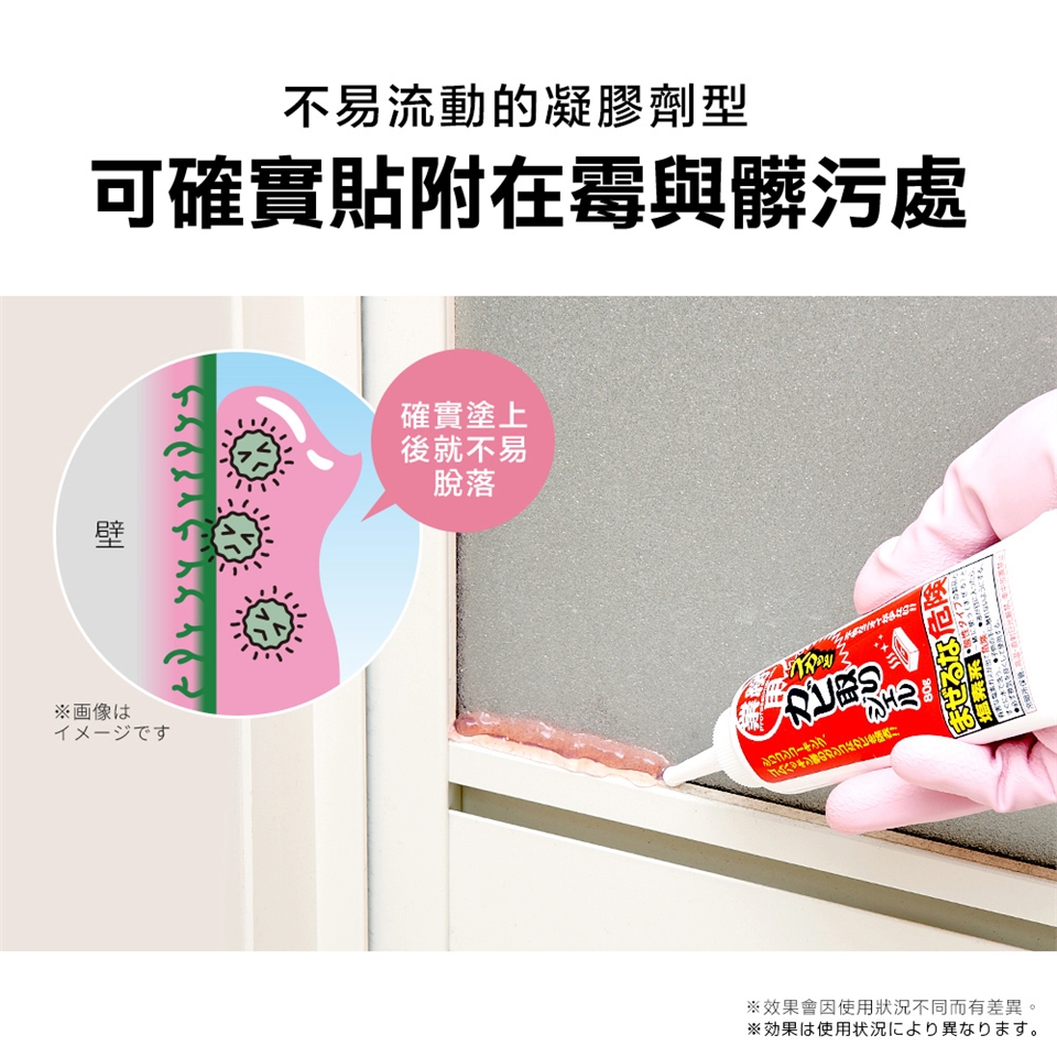 將除霉凝膠直接塗抹於髒污處,使凝膠與霉緊密接觸,成分會滲透到內部,頑強的霉也能去除。