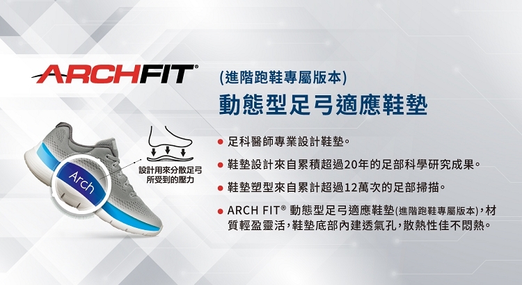 8.ARCH FIT系列,搭載ARCH FIT®動態型足弓適應鞋墊,具有足科醫生專業認證的足部舒壓平衡系統,能分散足弓所受到的衝擊力及壓力,並回饋穩定的支撐性和平衡性,提供穿著者足弓舒壓支撐的舒適感。
