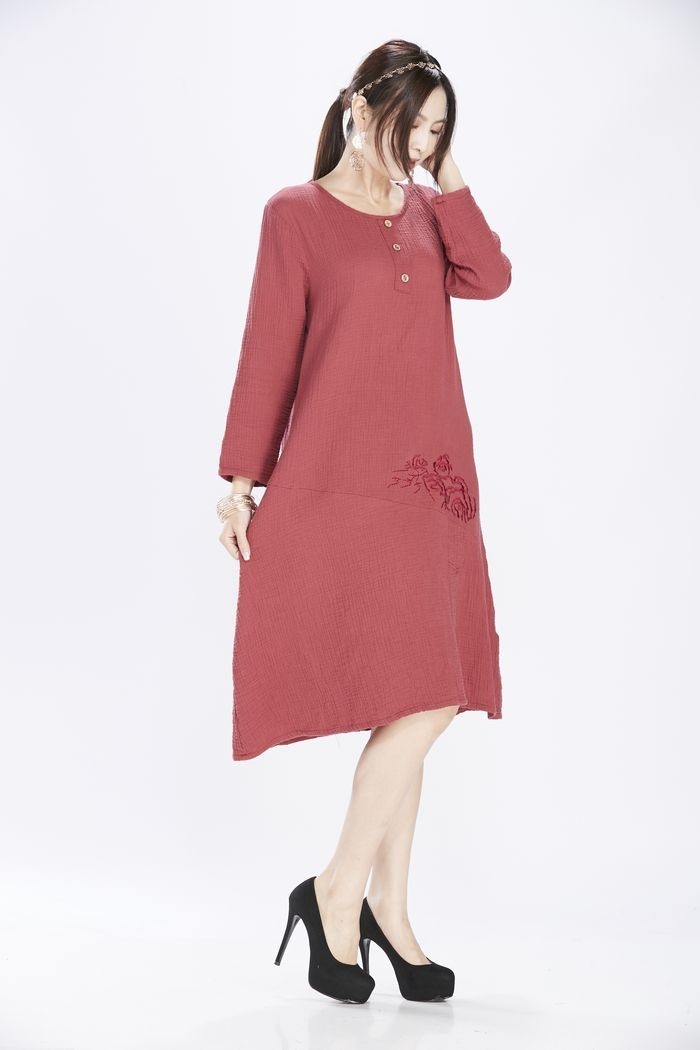 紅色:領口採用圓領,並以裝飾性半開襟作點綴,下擺使用拼接剪裁加上復古繡花,展現古典