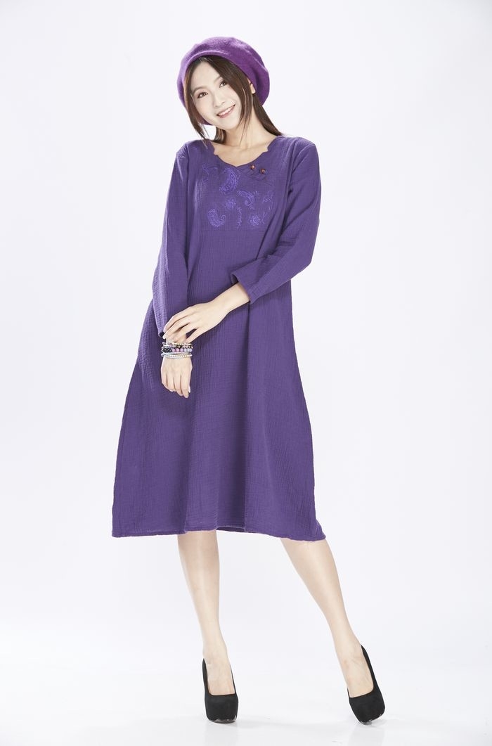 紫色:領口採用V型領,搭配裝飾性半開襟作點綴,胸前加上精美刺繡,呈現典雅柔美風格。