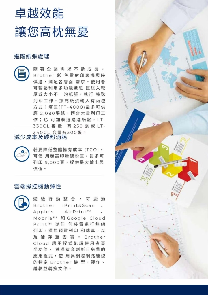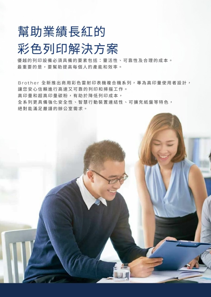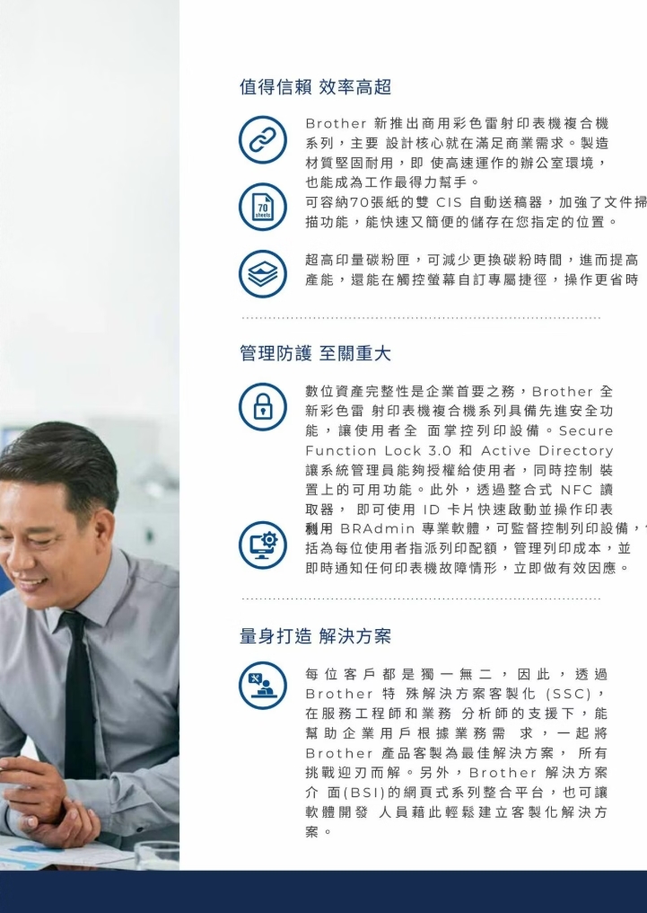 - 自動雙面列印、70 頁雙CIS自動送稿機(ADF)、 5吋彩色液晶螢幕