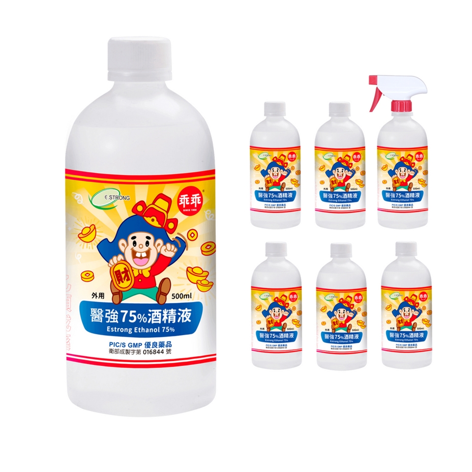 1、商品組合/規格:醫強X乖乖75%酒精液 6瓶招財組 500ml/瓶+酒精專用噴頭x1