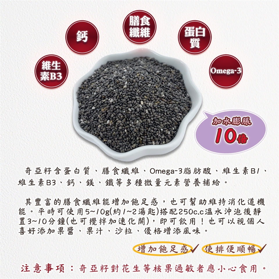 1.奇亞籽對花生等核果過敏者應小心食用。