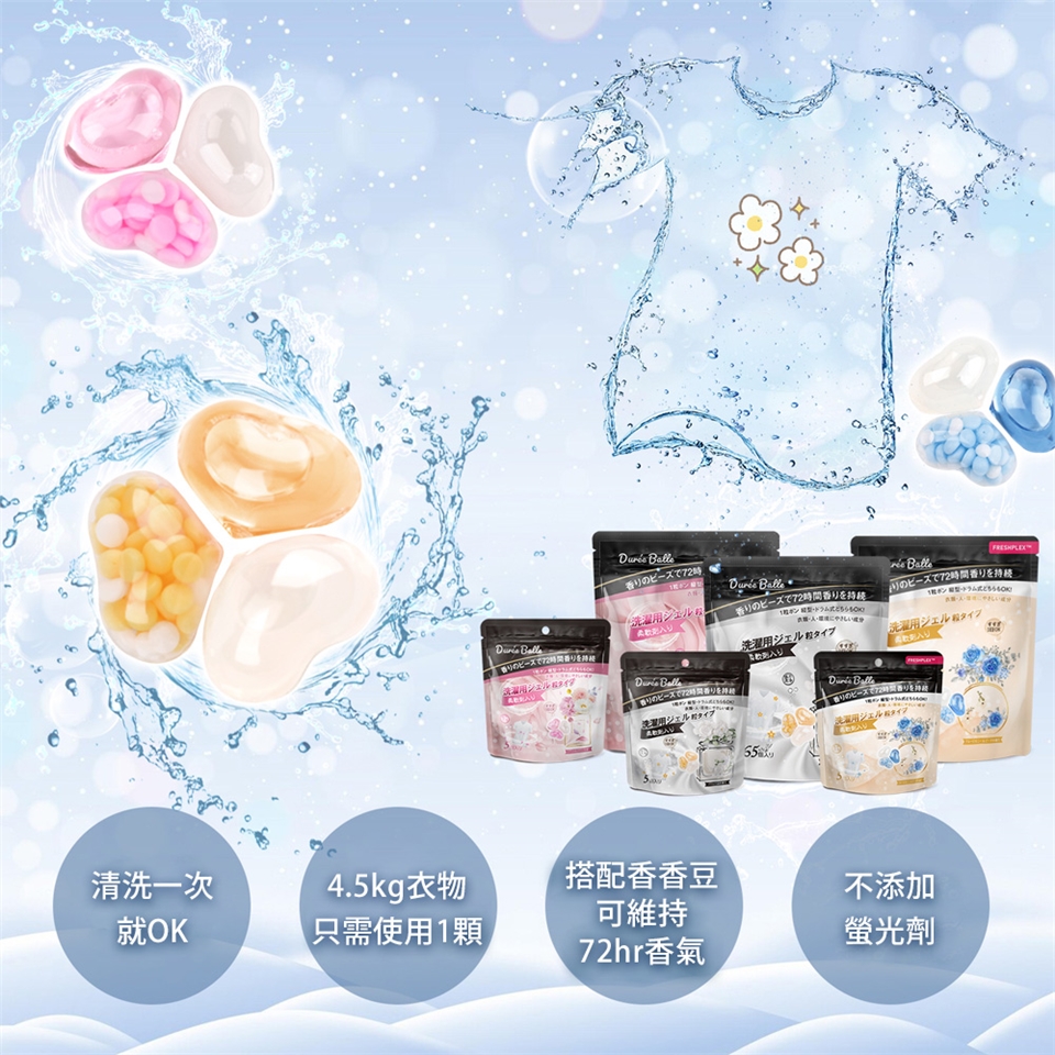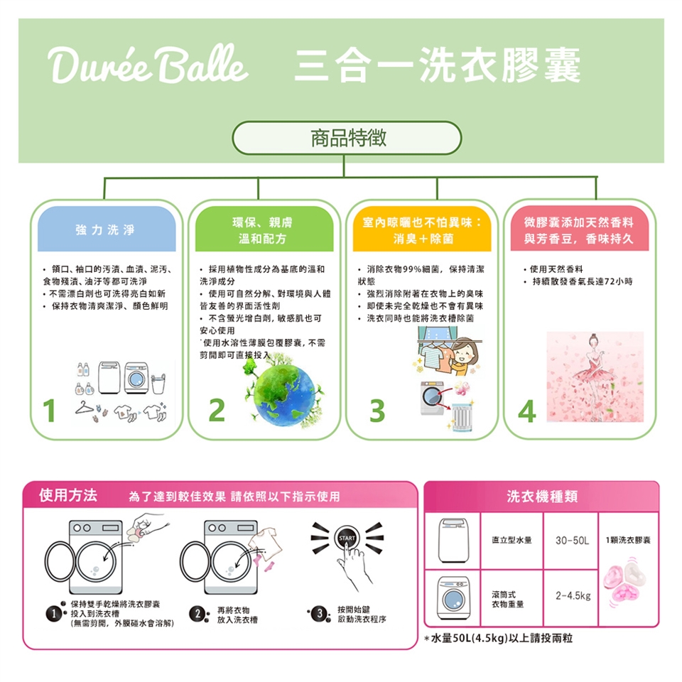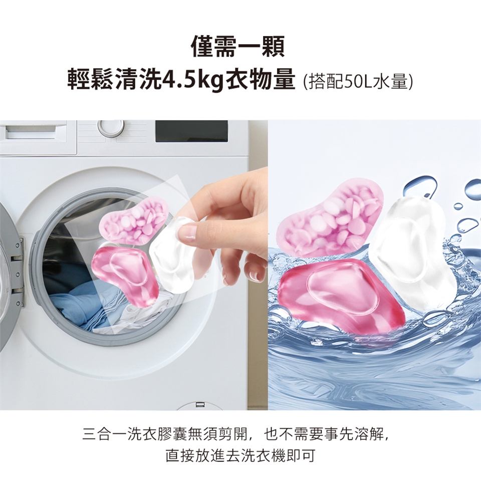 ①保持雙手乾燥將洗衣膠囊投入到洗衣槽(無須剪開,外膜碰到水會溶解) ②再將衣物放入洗衣槽 ③按開始鍵啟動洗衣程序