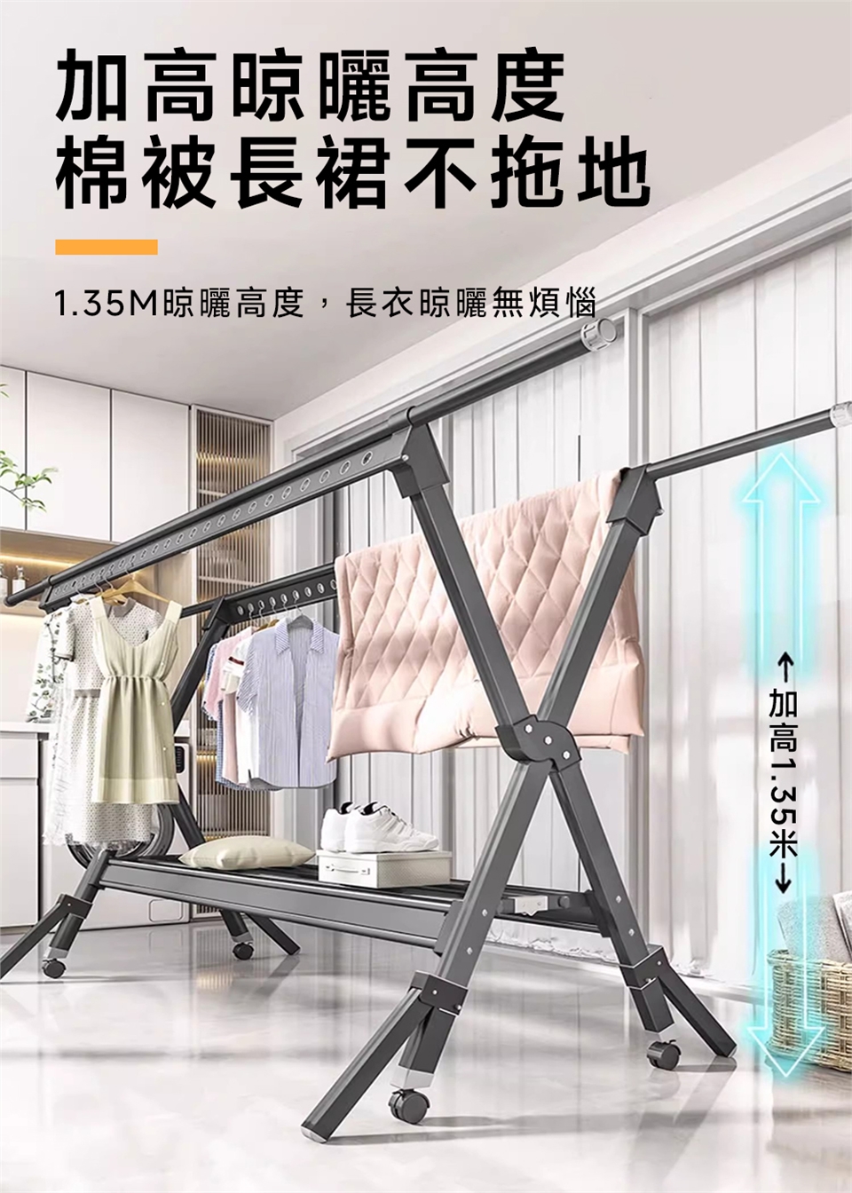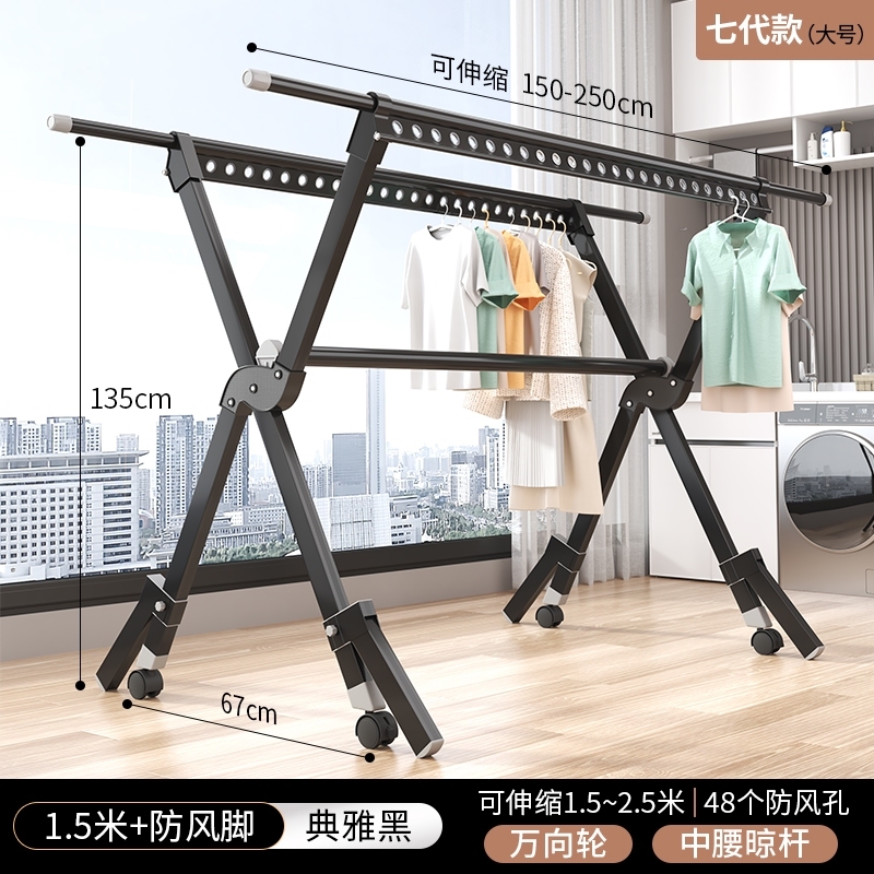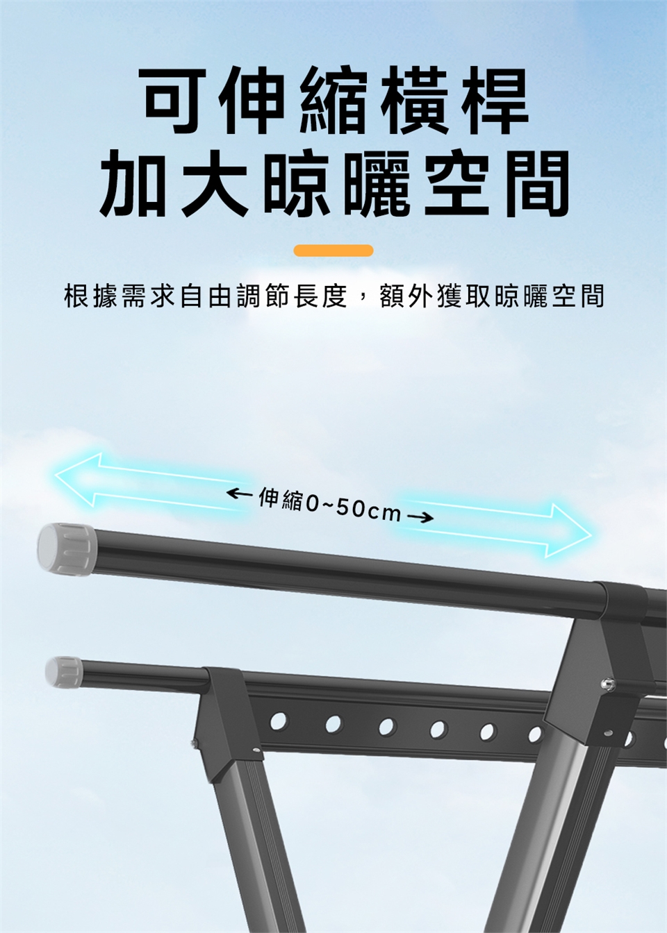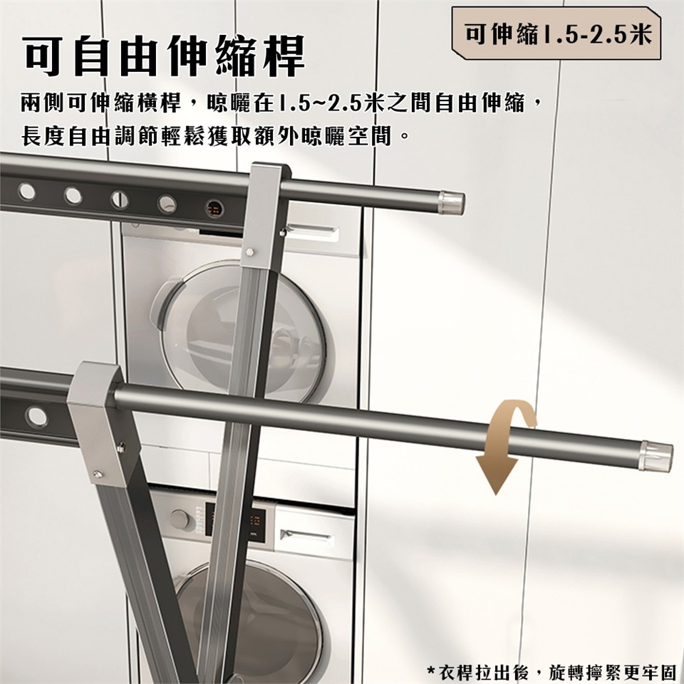 兩側可伸縮橫桿,晾曬在1.5~2.5米之間自 由伸縮,長度自由調節輕松獲取額外晾曬空間。