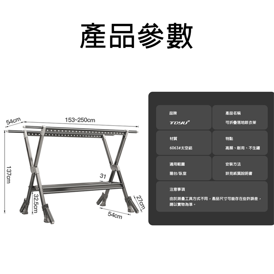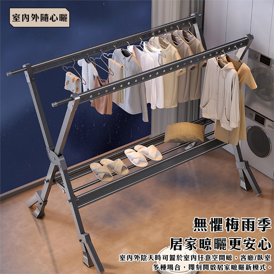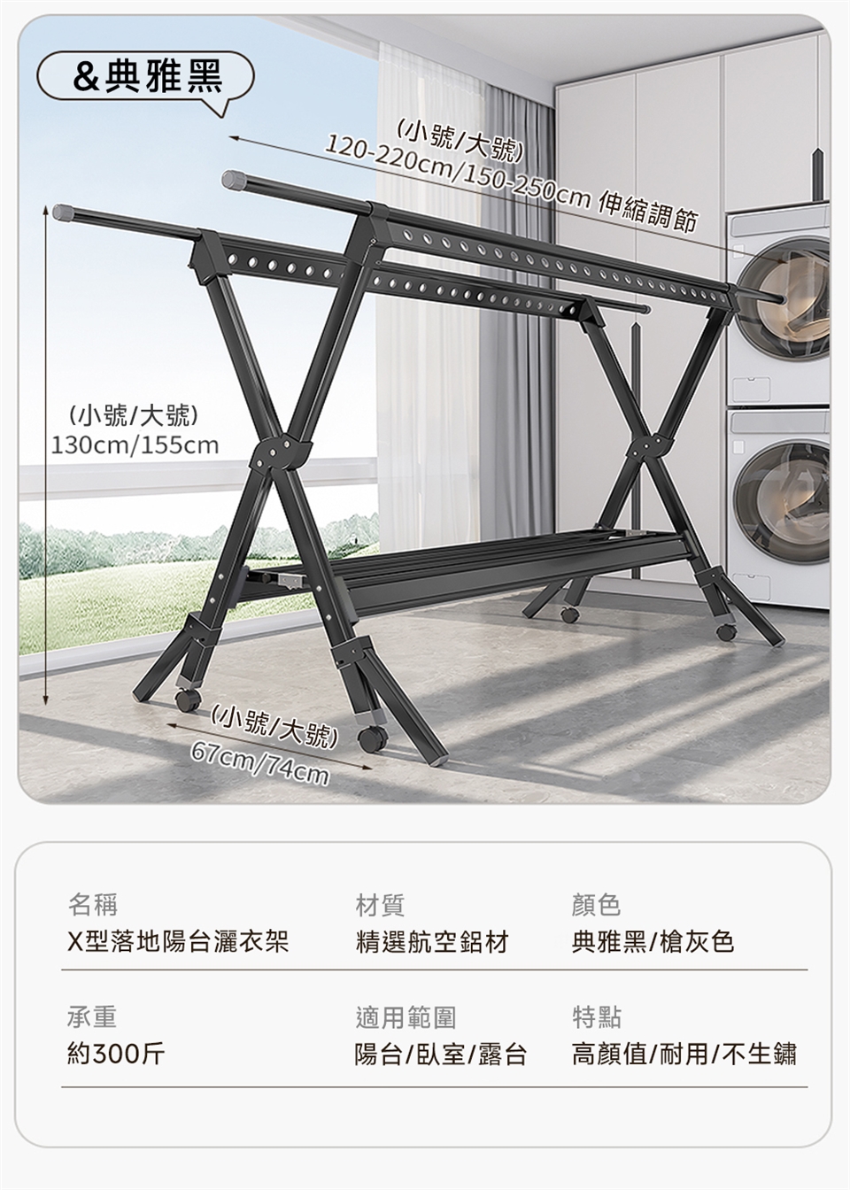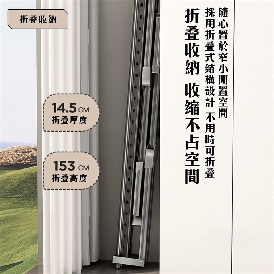 兩側可伸縮橫桿,晾曬在1.5~2.5米之間自 由伸縮,長度自由調節輕松獲取額外晾曬空間。