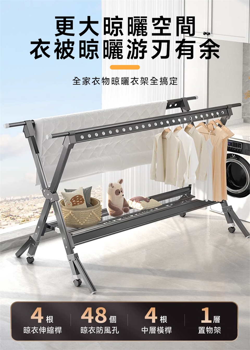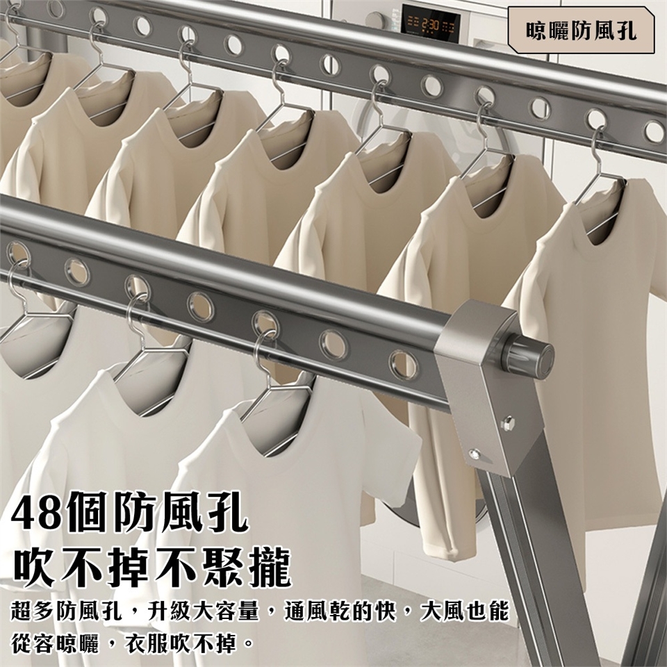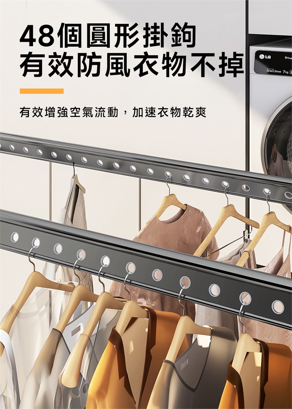 僅掛桿即有48衣架孔,即便犯懶衣服堆積了多天,一次清洗一同沐浴陽光,倍省事兒!