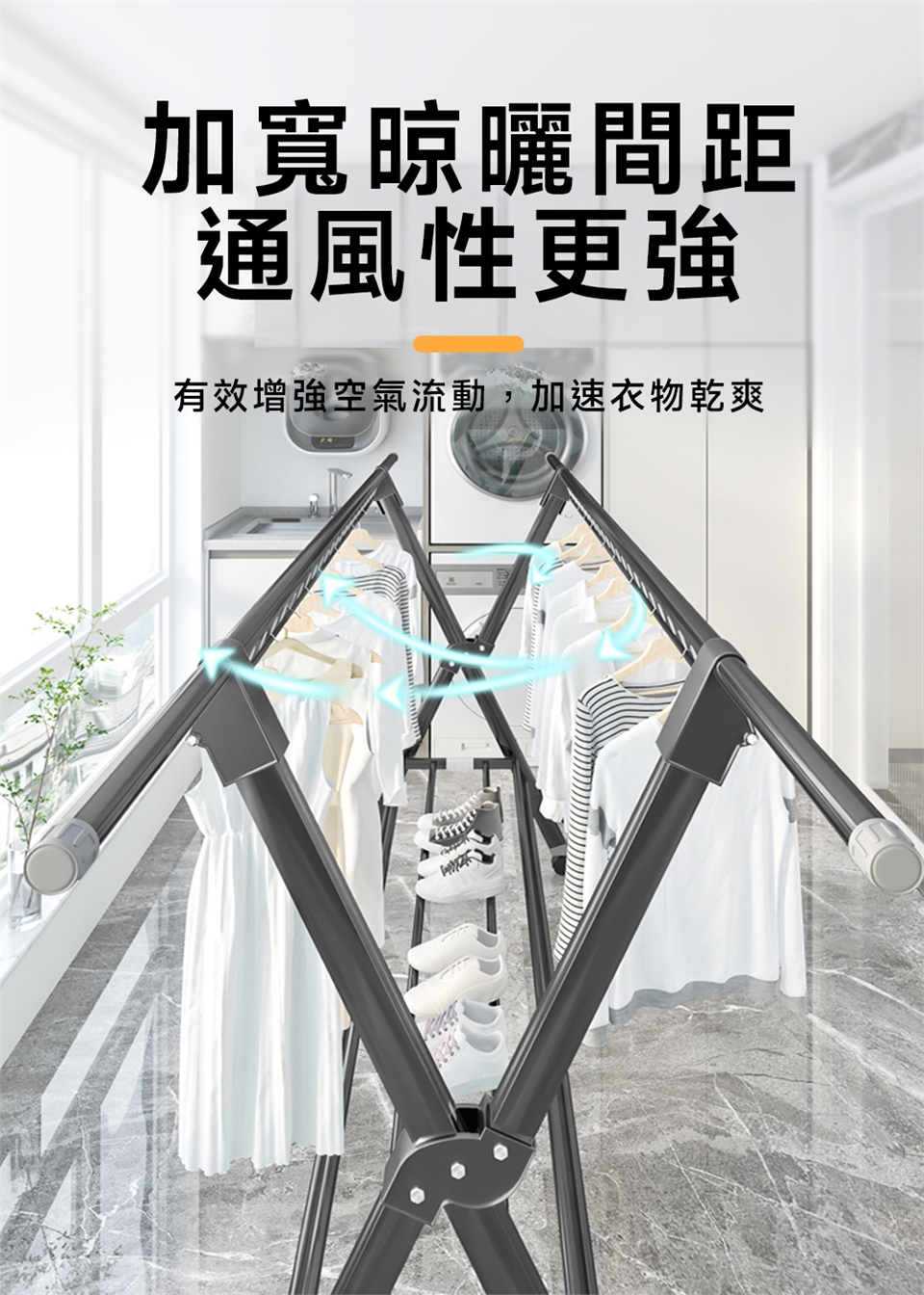 穩固防風腳升級更抗大風,室外晾曬不易掉落,讓陽光在衣服上流動起來。