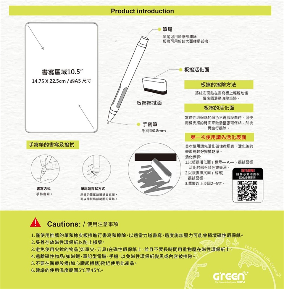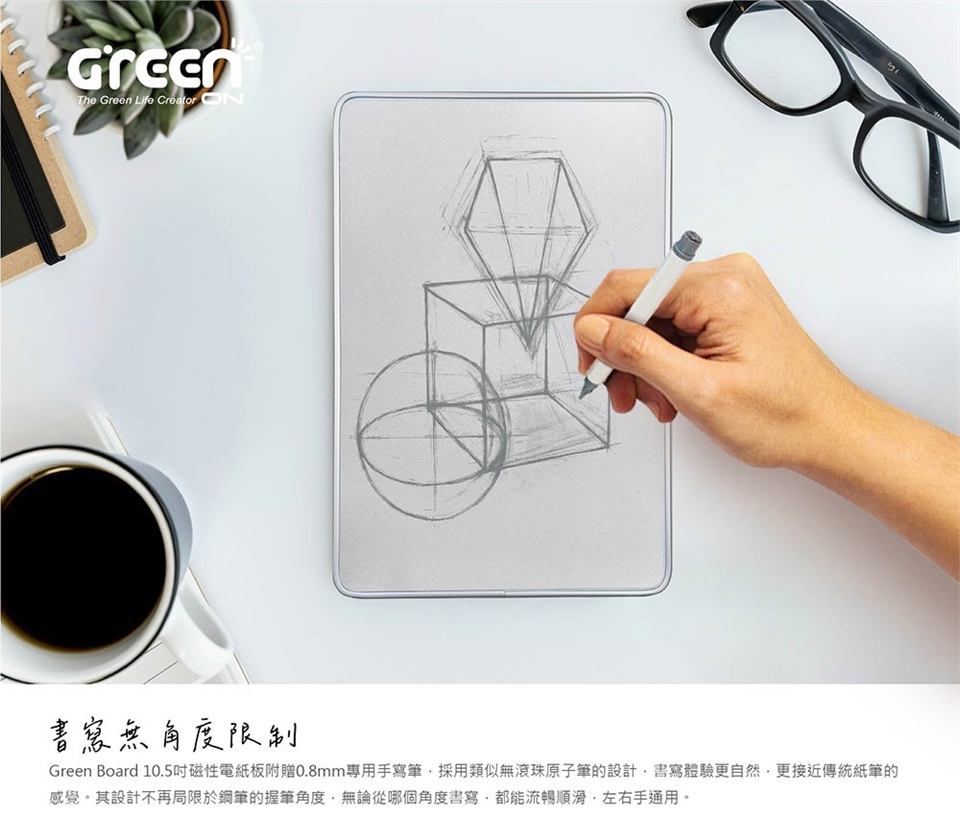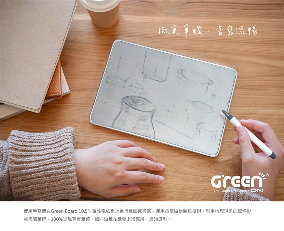 Green Board 10.5吋磁性電紙板,不需要額外添購墨水、粉筆等耗材,可不斷地重複使用,無紙化書寫,替代生活中隨手使用的大小紙張。永久免耗材,每書寫一次就是減碳行動,節省時間與金錢,環保愛地球。