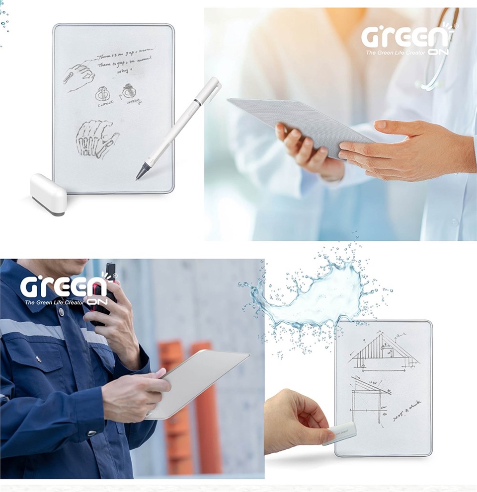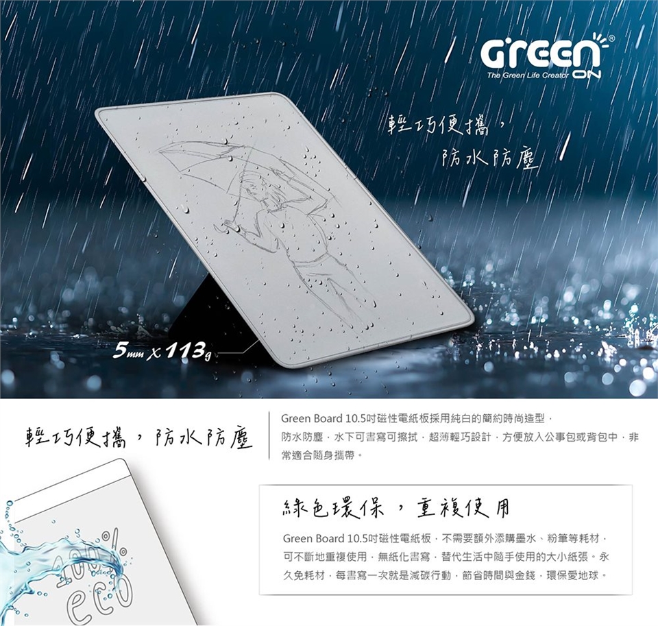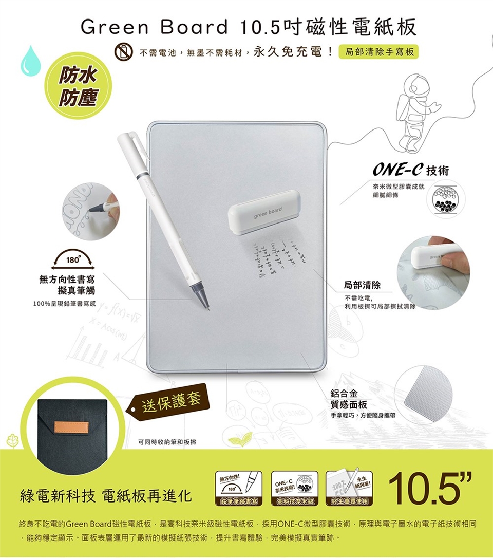 Green Board 10.5吋磁性電紙板採用純白的簡約時尚造型,防水防塵,有最高等級IPX8防水效果,水下可書寫可擦拭,超薄輕巧設計,方便放入公事包或背包中,非常適合隨身攜帶。