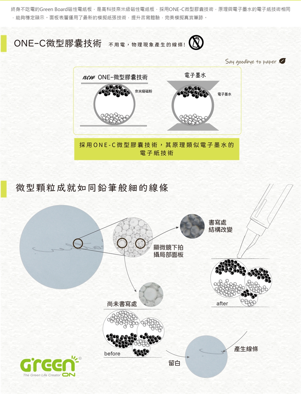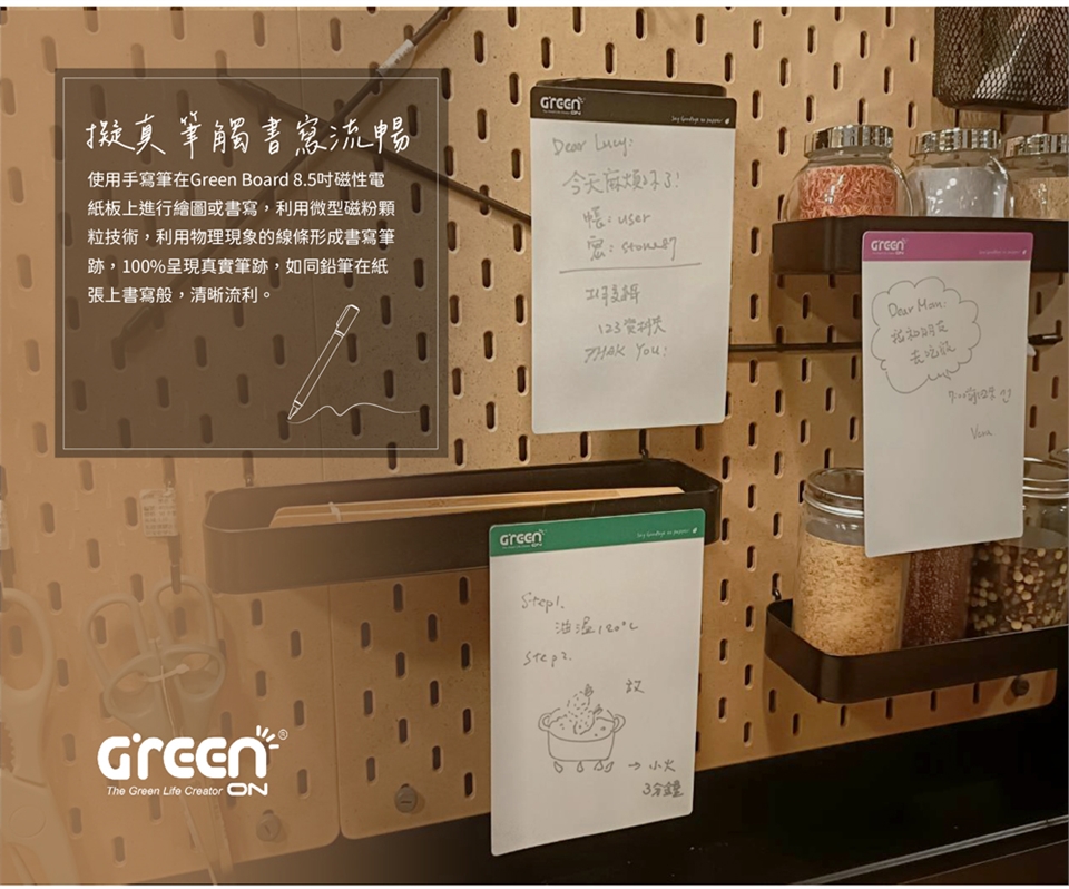 紙張科技化,電紙板再進化!終身不吃電的Green Board電紙板,高科技奈米級磁性電紙板,採用微型磁粉顆粒技術,類似電子墨水的電子紙技術,使用相同原理來產生穩定顯示。運用電生磁技術達到局部擦拭效果,面板表層採用最新模擬紙張技術,提供更好的書寫感受,模擬真實筆跡的書寫體驗。