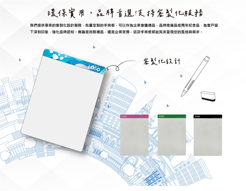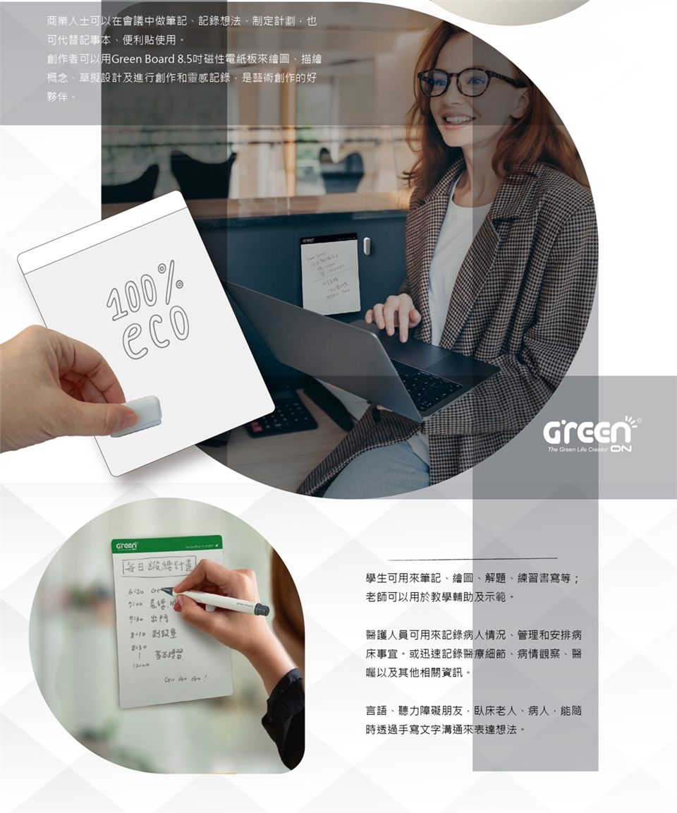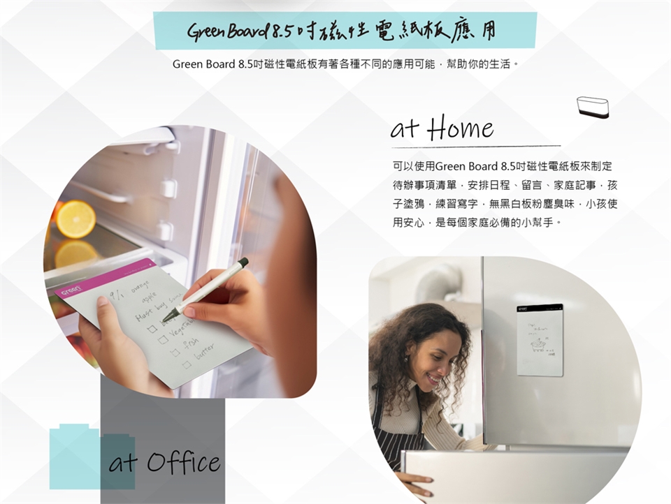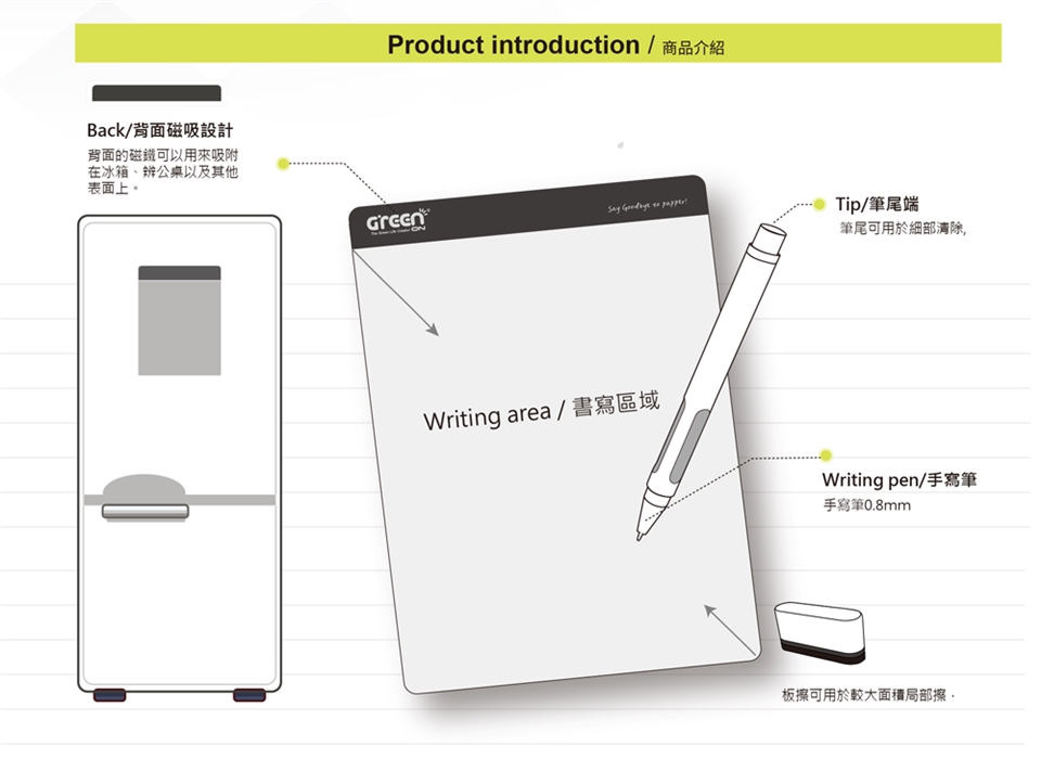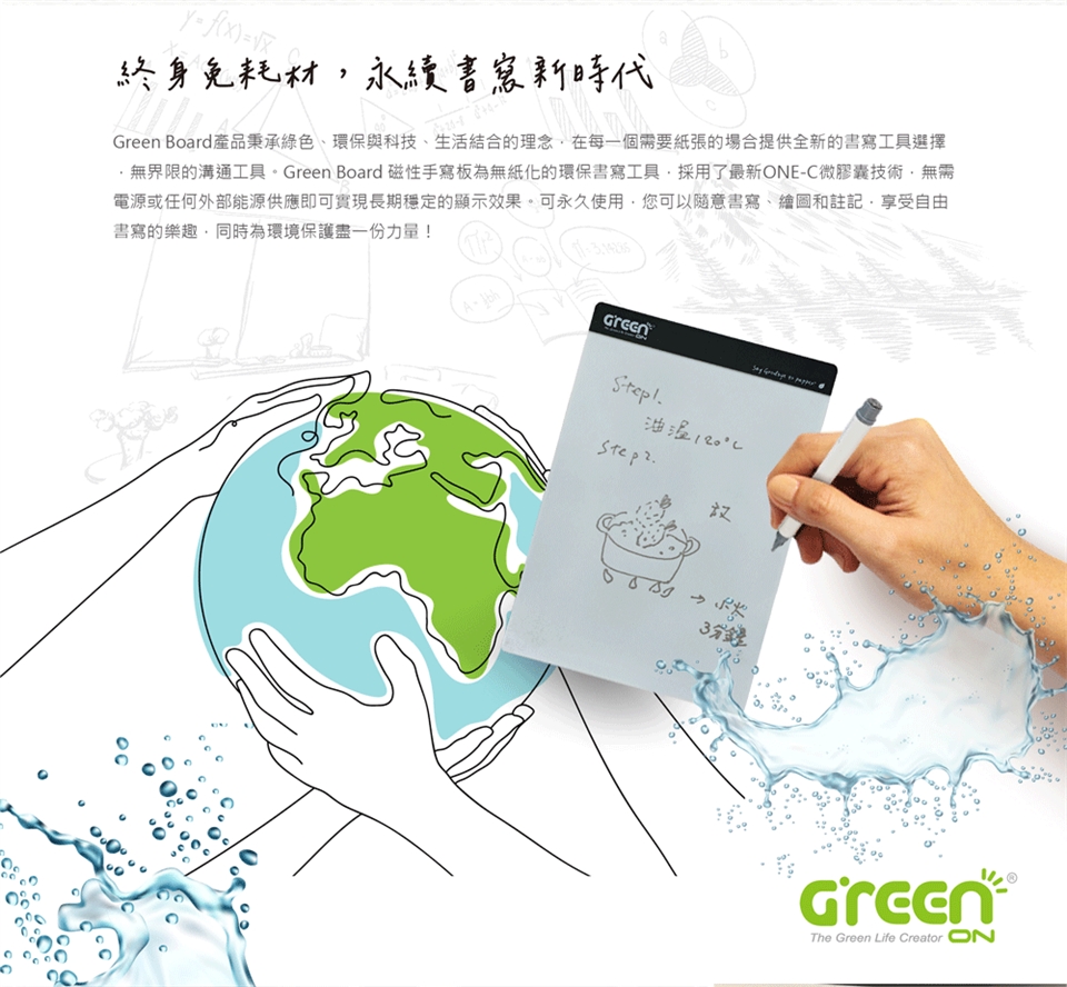 Green Board產品秉承綠色、環保與科技、生活結合的理念,在每一個需要紙張的場合提供全新的書寫工具選擇,無界限的溝通工具。Green Board 磁性手寫板為無紙化的環保書寫工具,採用了最新膠囊技術,無需電源或任何外部能源供應即可實現長期穩定的顯示效果。您可以隨意書寫、繪圖和註記,享受自由書寫的樂趣,同時為環境保護盡一份力量!