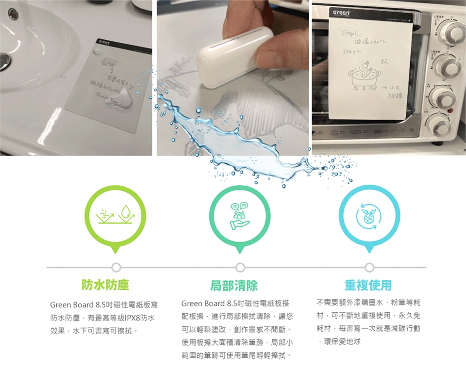 Green Board 8.5吋磁性電紙板寫防水防塵,有最高等級IPX8防水效果,水下可書寫可擦拭。