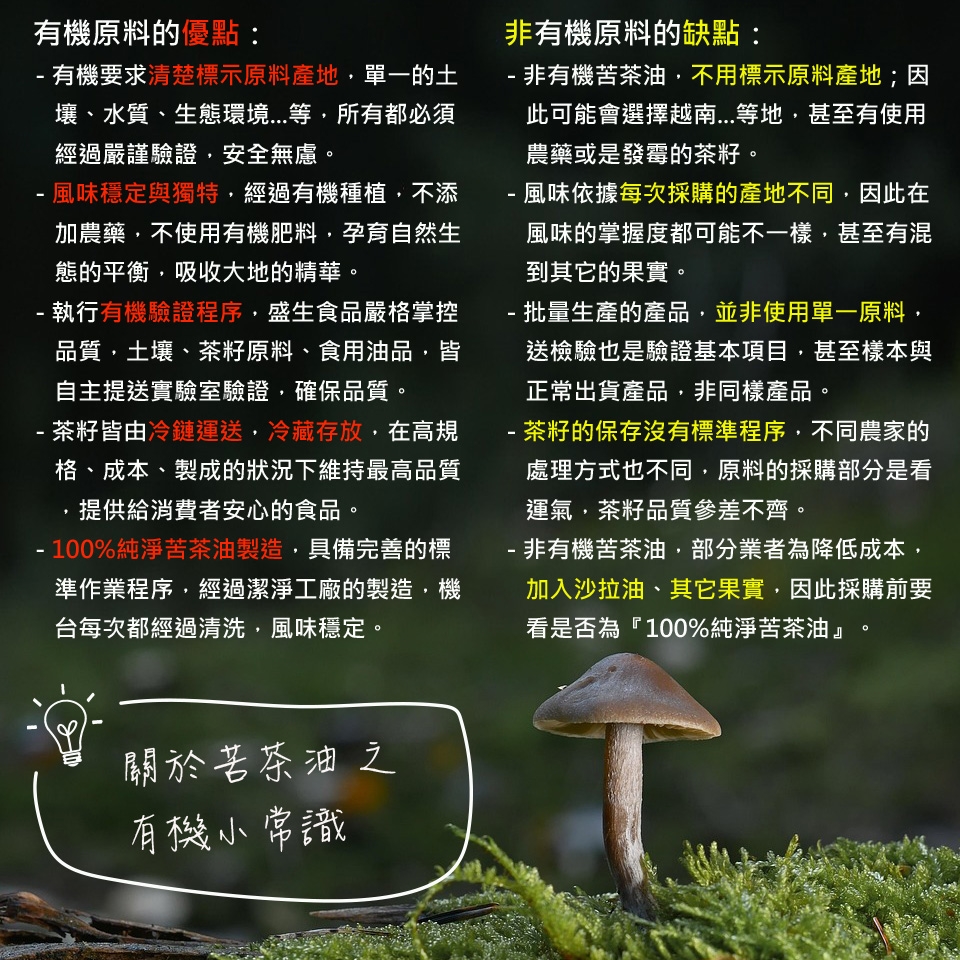 ‧烹調:苦茶油發煙點高達230℃,煎、煮、炒、炸、拌等烹調方式都適用。