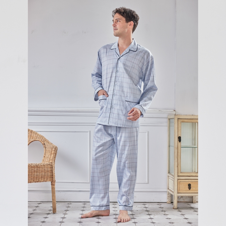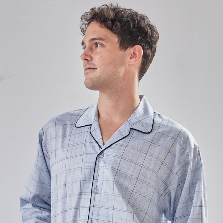 GOLDDEER金鹿 -青年中格夏季款100%棉國民領長袖褲裝睡衣