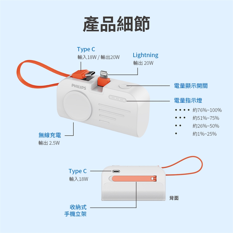 18W PD快充回補行動電源,搭配20W旅充頭約1.5H即可充飽