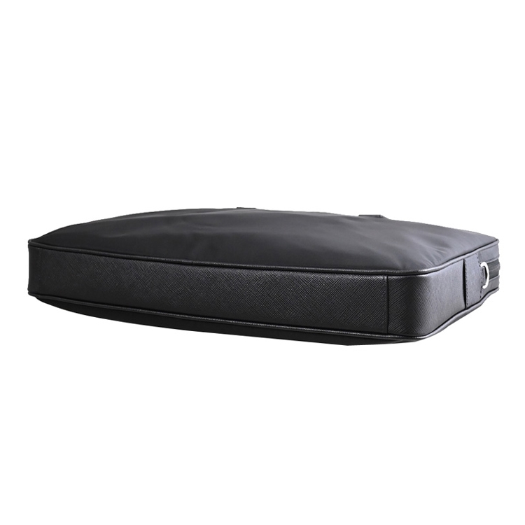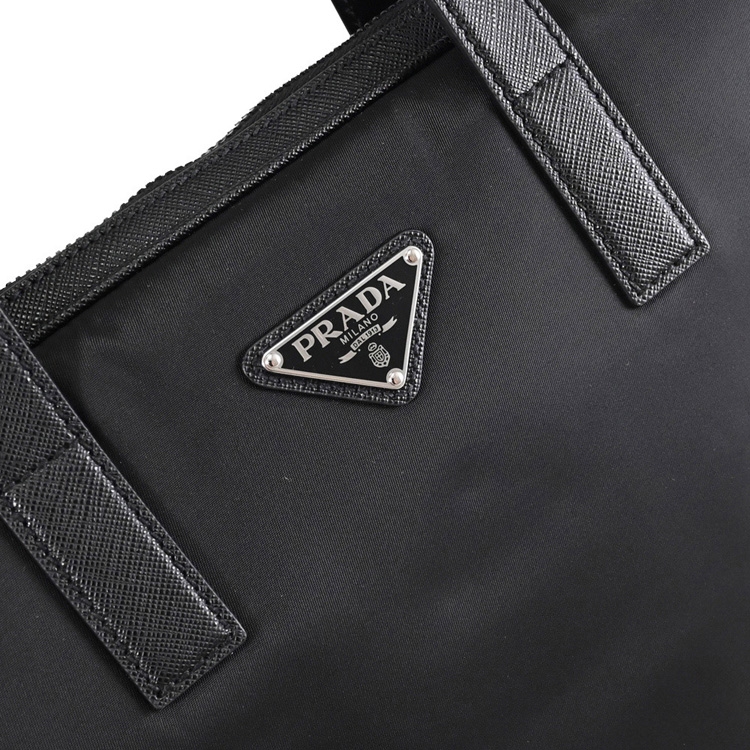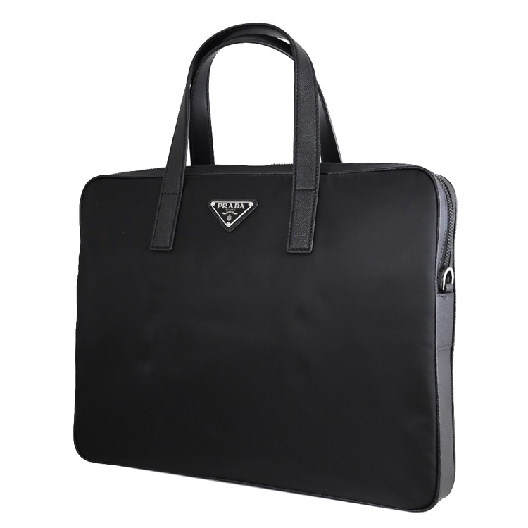 PRADA 專櫃經典熱銷公事包款,經典三角LOGO裝飾,採用輕量尼龍材質拼接皮革+三角LOGO設計,拉鍊開口,內有1拉鍊袋+2貼袋供收納,內可放A4文件、iPad或摺疊傘等隨身物品,大容量空間,不論是上班族或出差皆為實用,簡單亮眼有型。