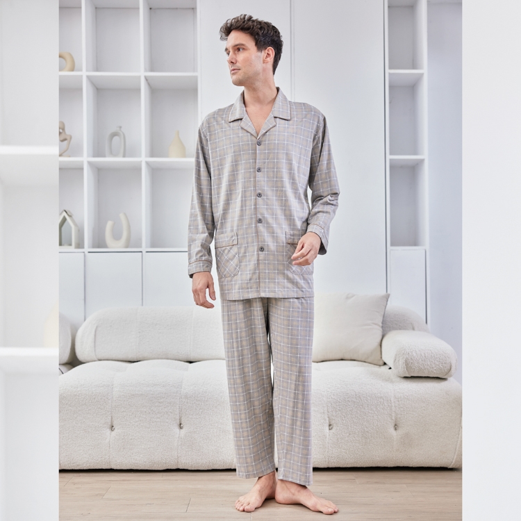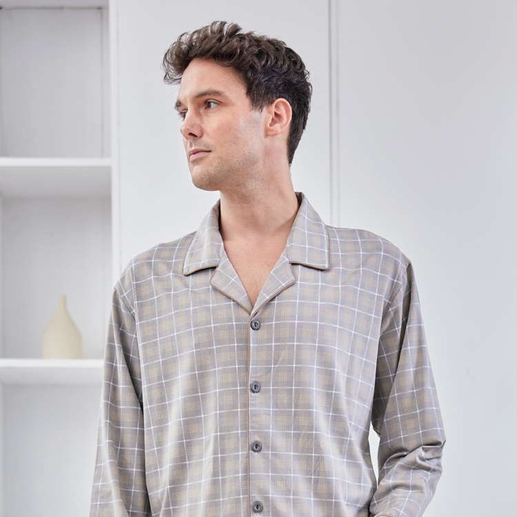 ◎帶給人寧靜自在的格紋色調, 加上國民領搭配長袖長褲設計,超柔細手感,寬鬆舒適,簡約的裁剪線條、入夢後完全無束縛感。