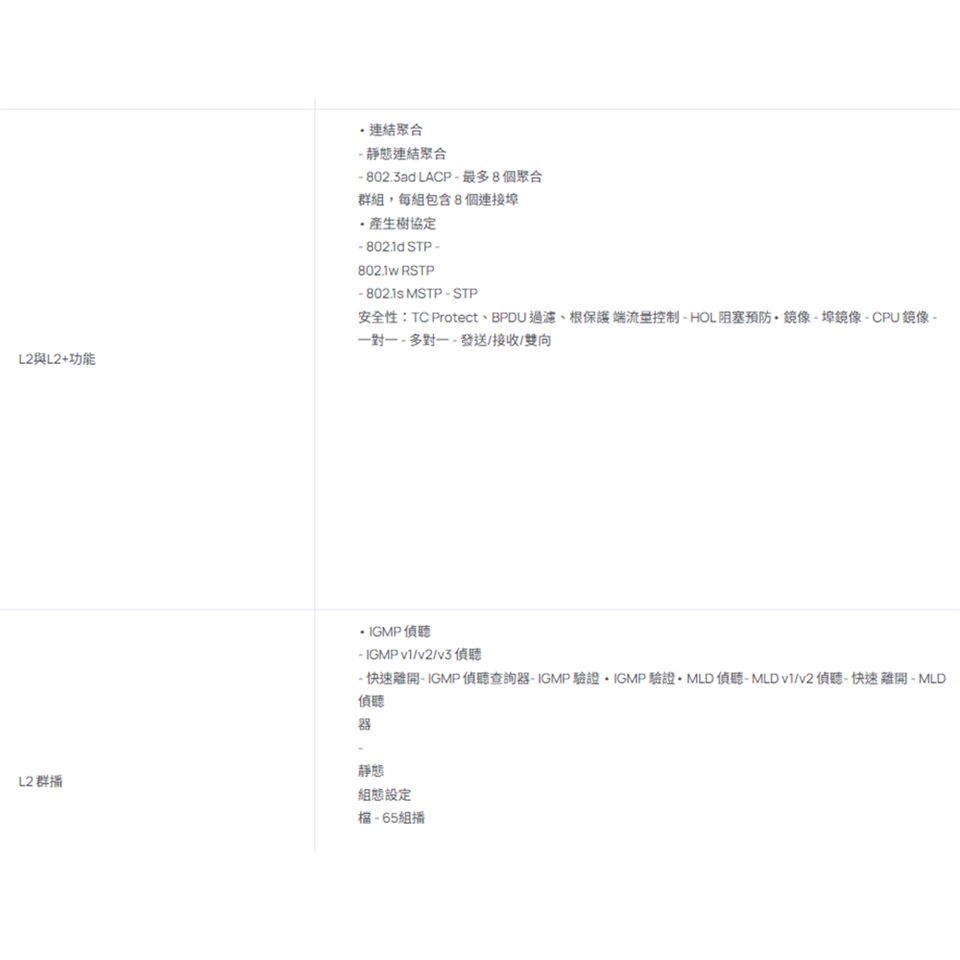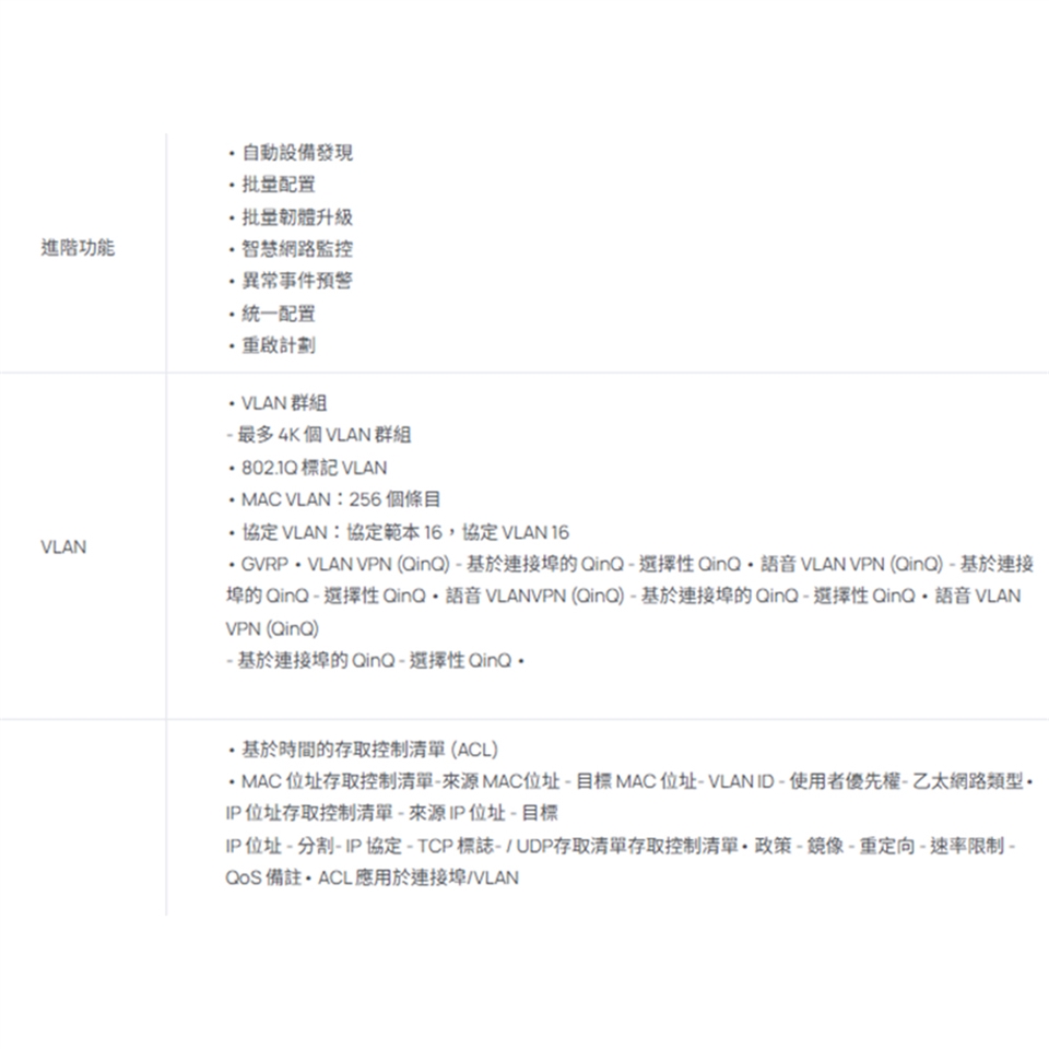 -強大的安全性策略:IP-MAC-連接埠綁定、ACL、連接埠安全、DoS防禦、風暴控制、DHCP偵聽、802.1X、Radius驗證等。