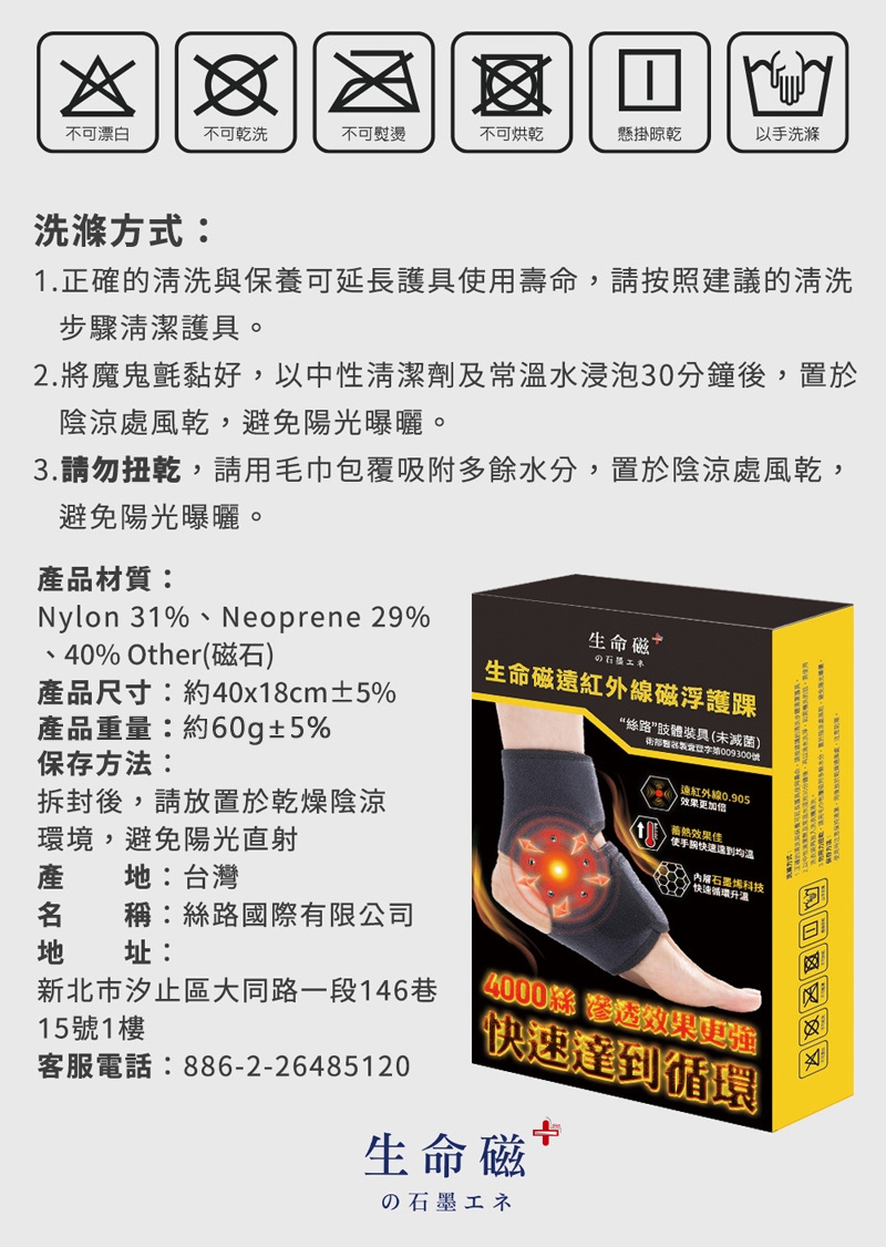 建議穿戴每2小時應卸下護具10分鐘,讓肌肉組織緩解恢復:若使用時感到不識,請立即停止使用。