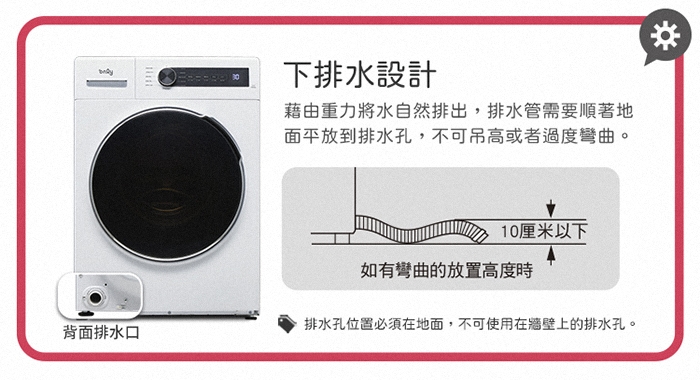 藉由重力將水自然排出,排水管需要順著地面平放到排水孔,不可吊高或者過度彎曲。(排水孔位置須在地面,不可使用牆上排水孔)
