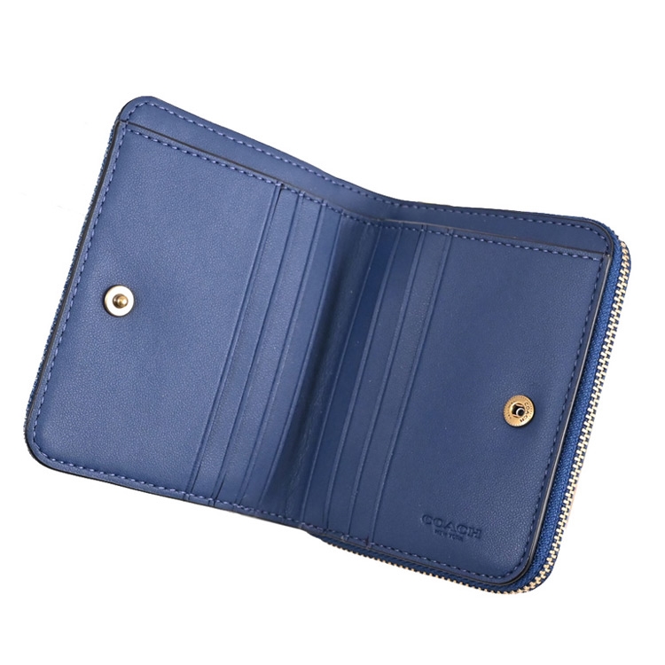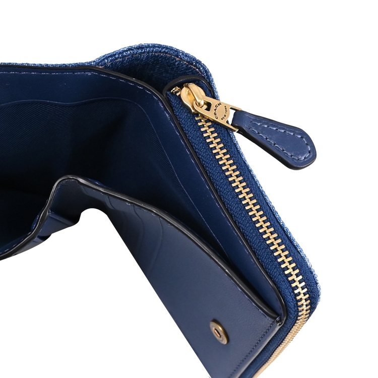 COACH 專櫃商品,ESSENTIAL系列時尚短夾,經典C字LOGO搭配質感牛仔帆布材質,扣式開口,內有6卡片夾層+2貼袋+1鈔票層+1拉鍊零錢袋(2隔層),釋放都會簡約風格,兼具典雅時尚氣質,是款耐用的實用單品配件。