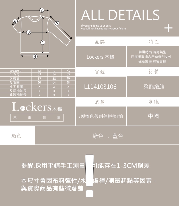 【Lockers 木櫃】V領撞色假兩件拼接T恤 L114103106