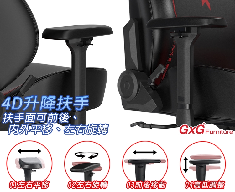 扶手可以高低升降,可以根據您使用偏好調整到適當的高度,扶手面可前後調整、內外平移、左右旋轉一段。