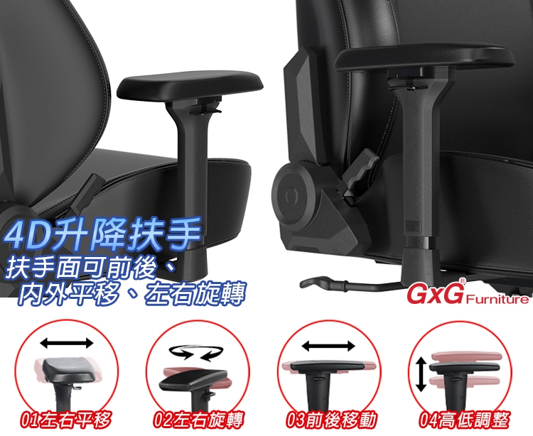 扶手可以高低升降,可以根據您使用偏好調整到適當的高度,扶手面可前後調整、內外平移、左右旋轉一段。