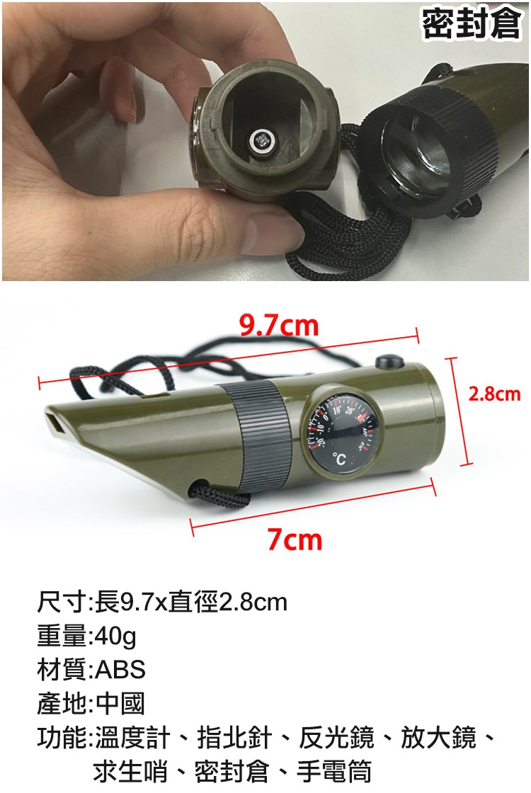 功能:溫度計、指北針、反光鏡、放大鏡、求生哨、密封倉、手電筒