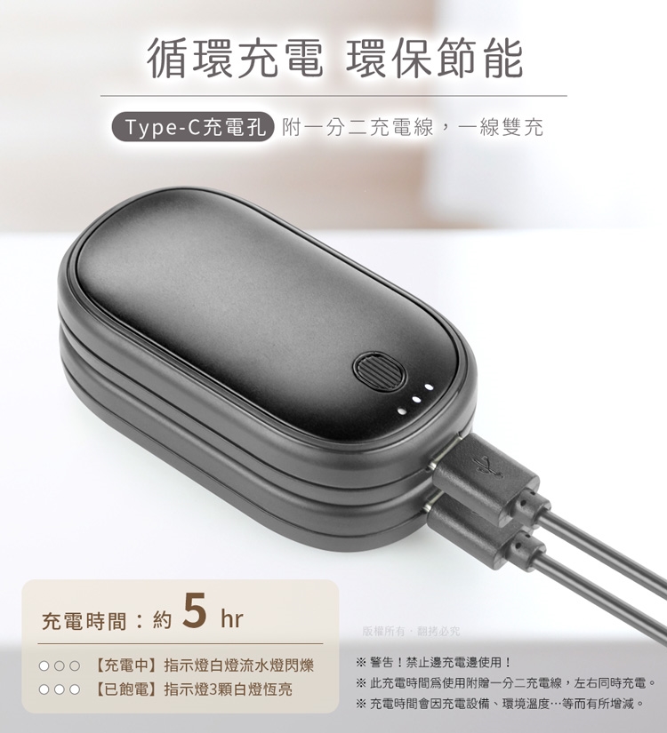 1.充電時,將內附一分二Type-C充電線插入暖手寶充電孔,另一頭可插入